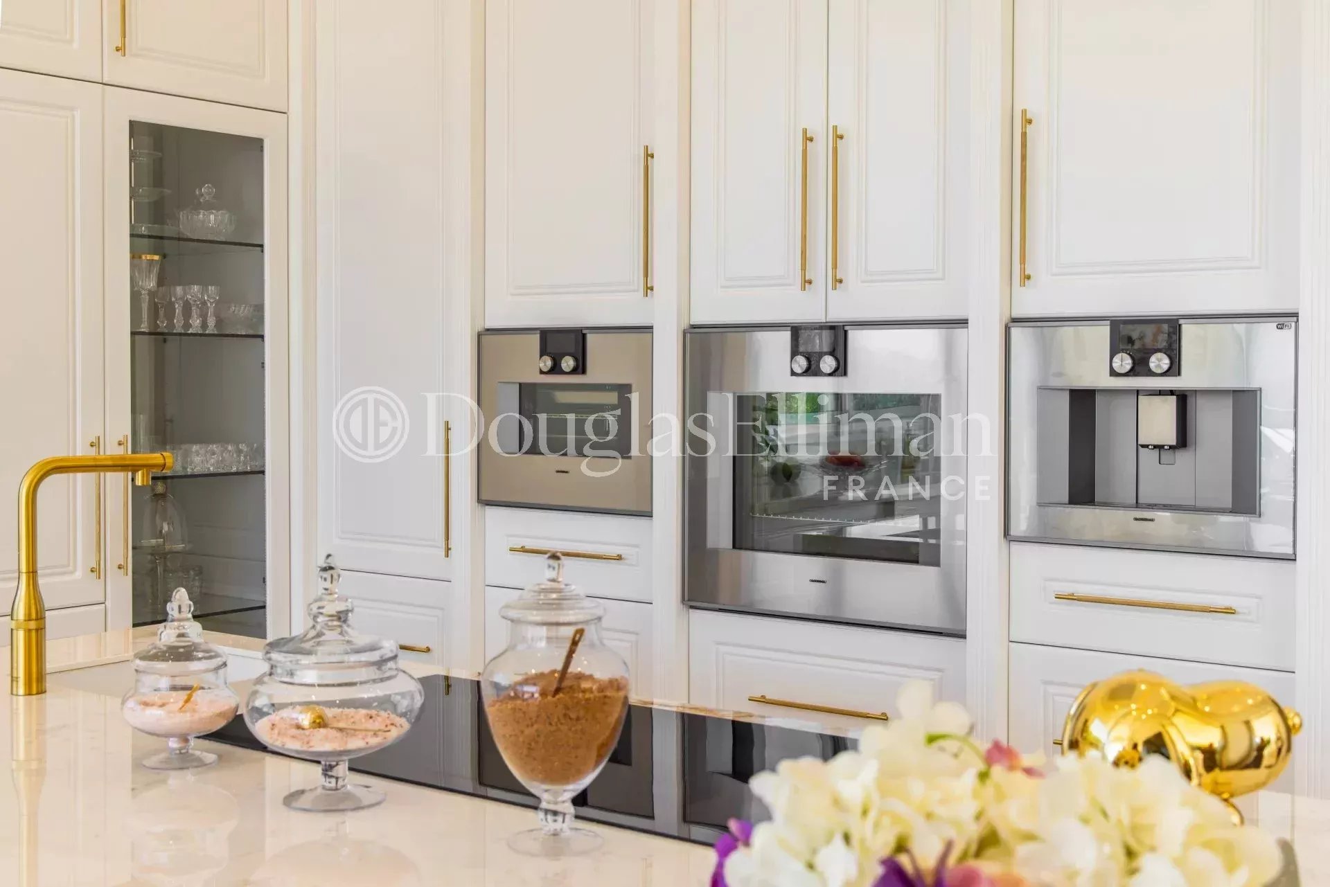 La villa impressionne immédiatement par son hall d'entrée à double hauteur, doté d'un vaste mur de marbre blanc. Le vaste espace de vie et de repas est incroyablement lumineux et aéré, grâce à ses nombreuses baies vitrées qui donnant sur la terrasse extérieure couverte, le jardin et la piscine. La cuisine haut de gamme est conçue sur mesure avec des finitions de tons et des plans de travail en marbre.