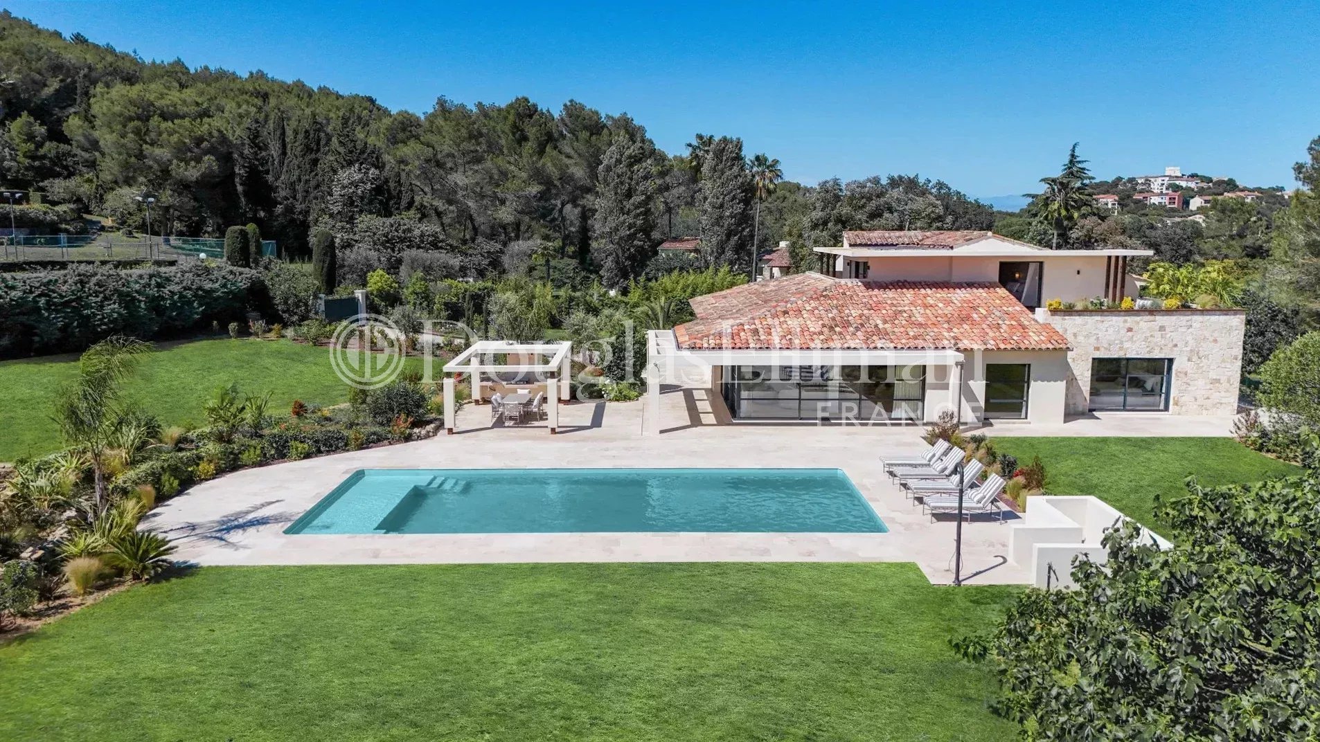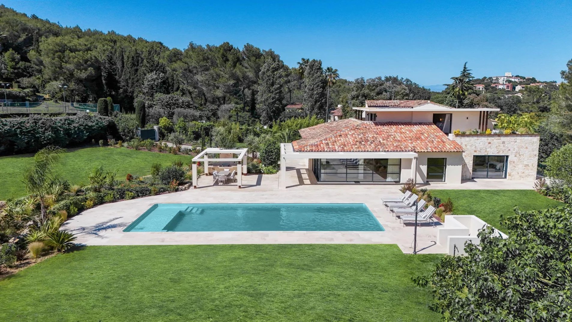 A seulement quelques minutes de Cannes, cette propriété contemporaine entièrement rénovée incarne le raffinement et le confort au cœur d’un domaine privé exclusif.