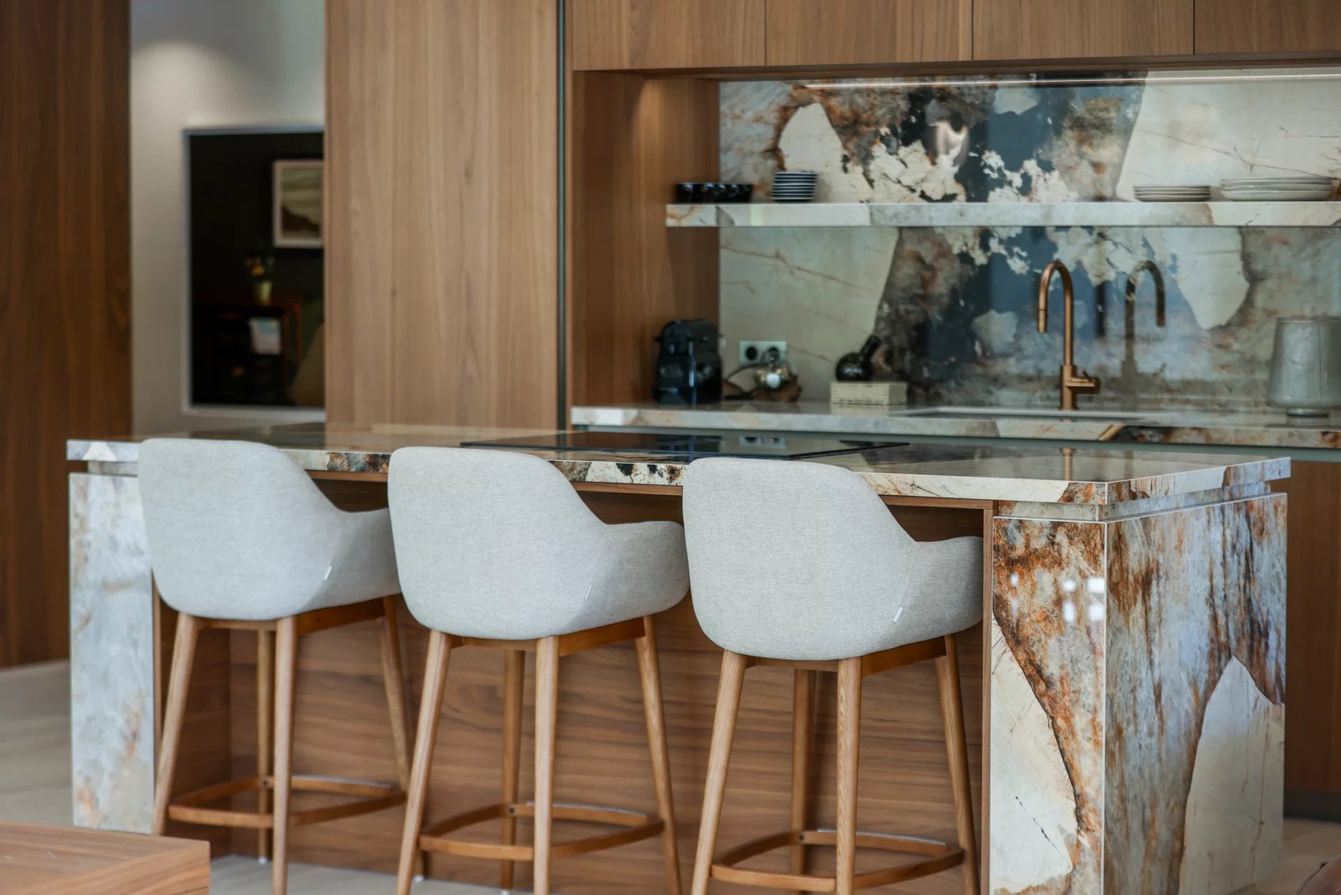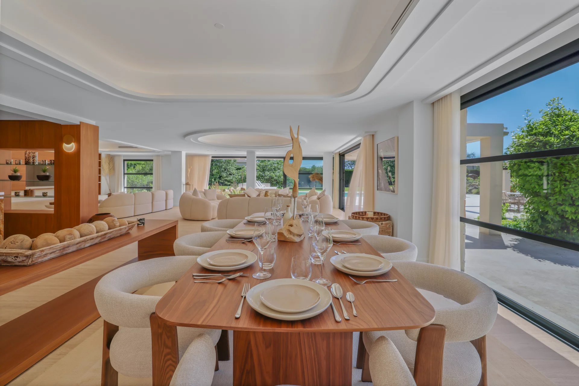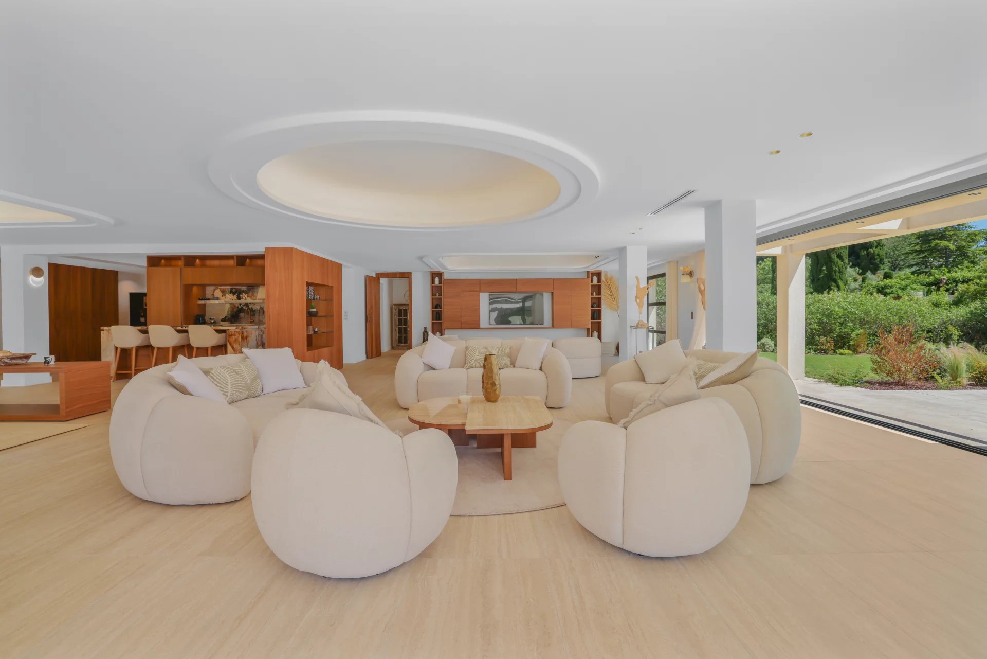 Trois belles suites de plain-pied offrent une indépendance rare et un accès direct aux jardins paysagés. Le vaste espace de vie, baigné de lumière grâce aux grandes ouvertures, réunit séjour et salle à manger dans une ambiance à la fois chaleureuse et épurée. La cuisine, parfaitement équipée, se prolonge d’une arrière-cuisine discrète, pensée pour recevoir en toute sérénité.
