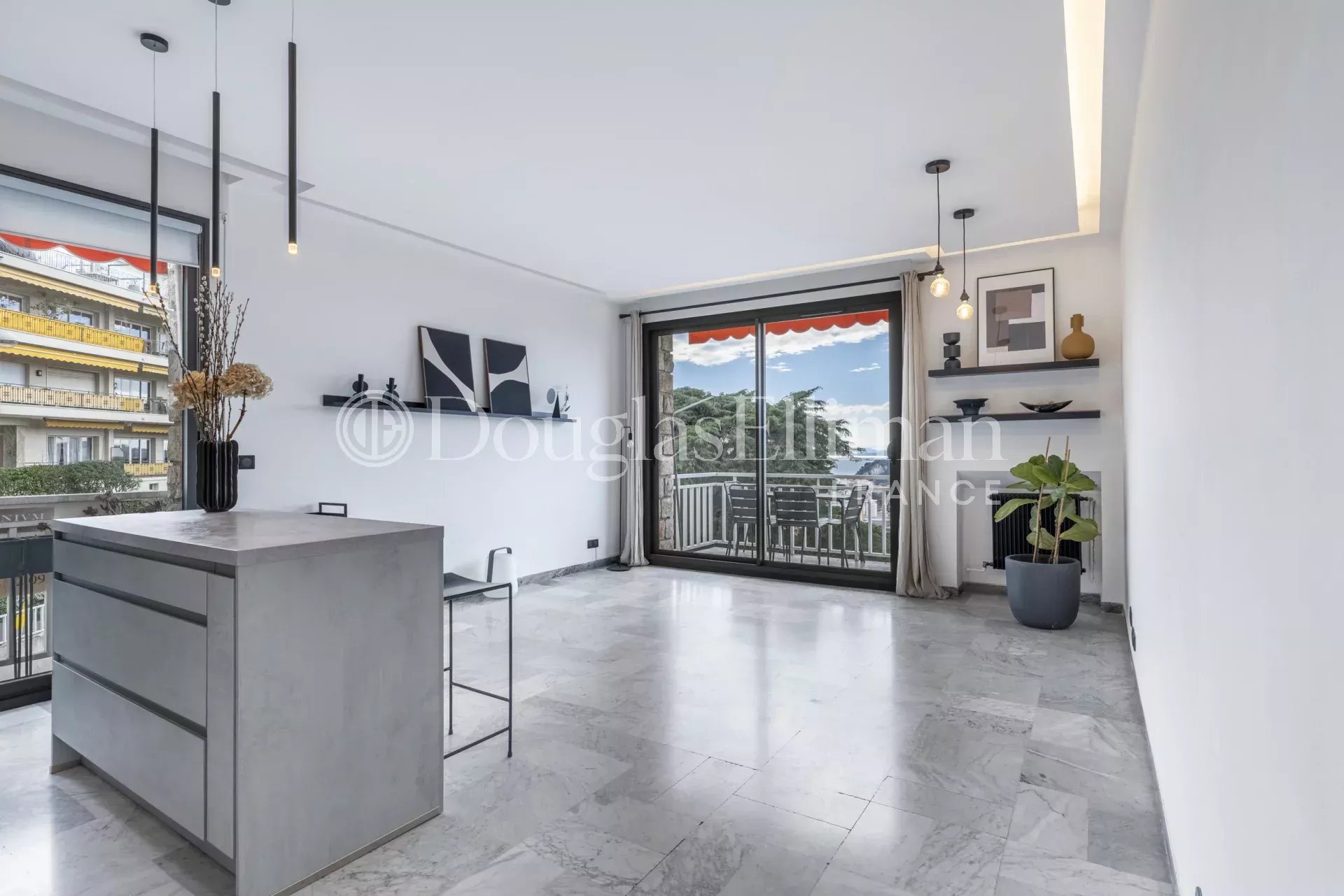 L'appartement, situé au deuxième étage, est entièrement rénové avec des beaux matériaux, est composé de trois pièces principales, dont deux chambres avec balcon, un living-room avec cuisine américaine, une terrasse avec vue mer et ville panoramique, une salle de douche avec W.C et un W.C invité.