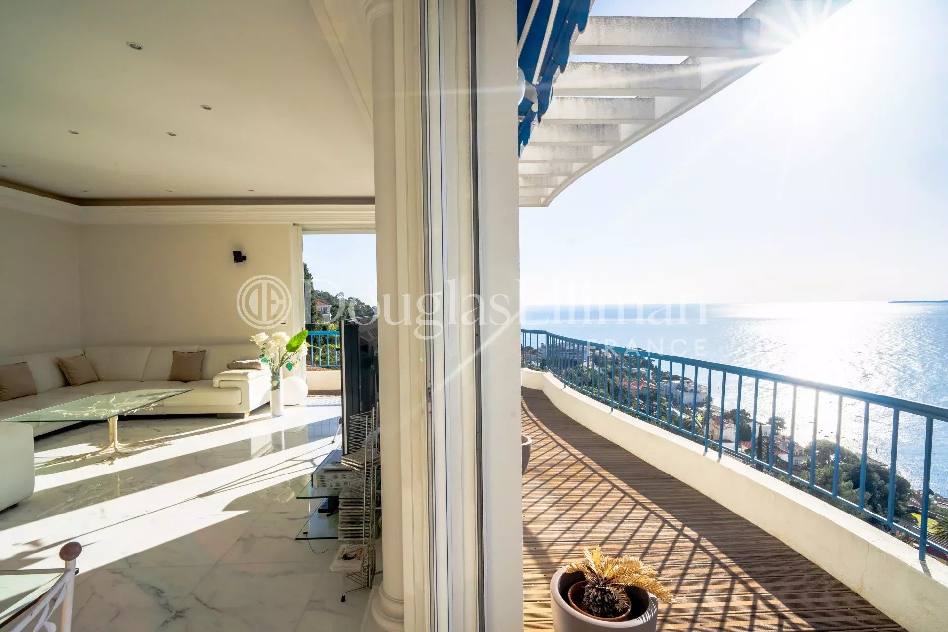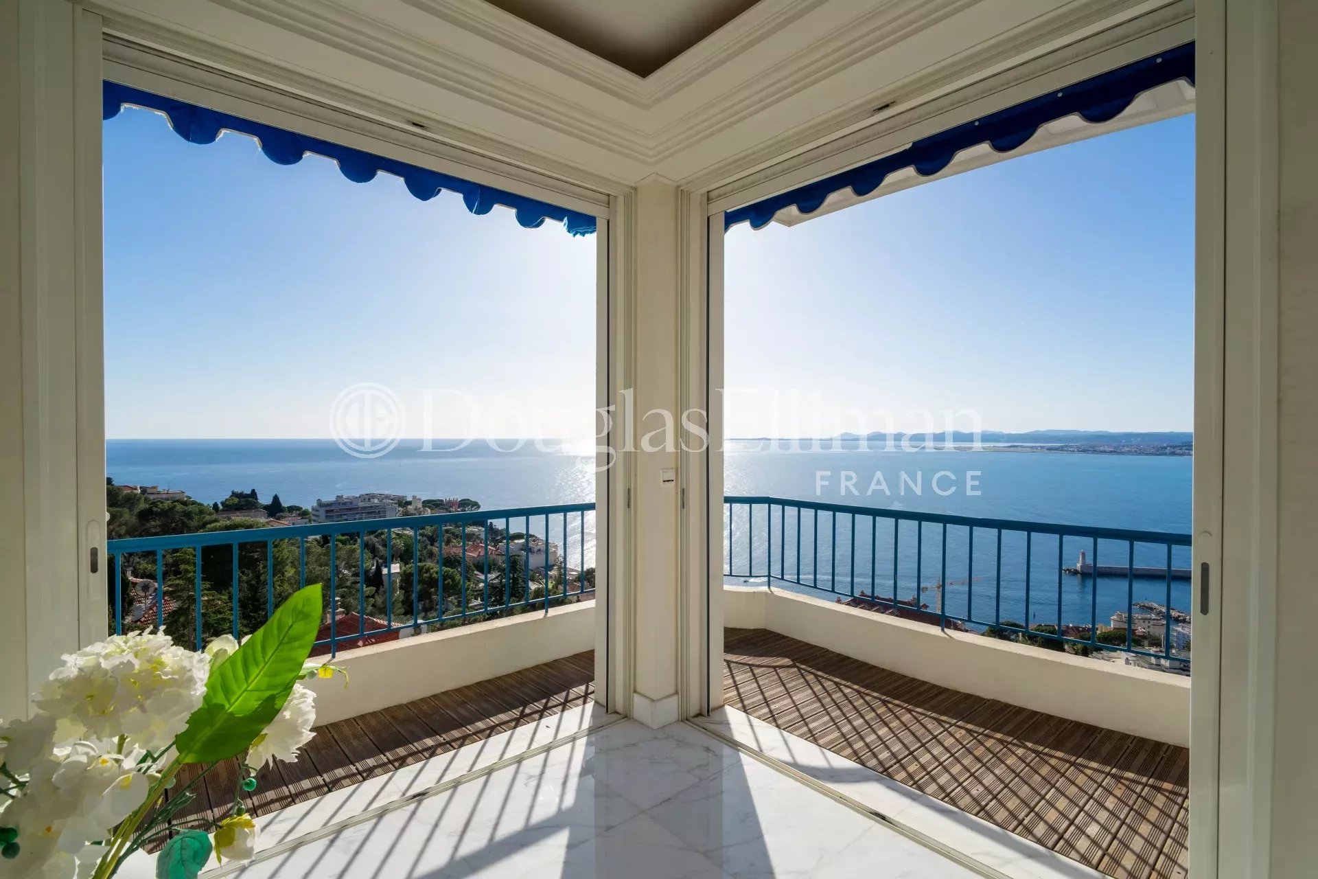 Le hall d’entrée mène à une élégante salle de réception, baignée de lumière, dotée de portes coulissantes en verre permettant de profiter pleinement de cette vue magnifique sur la mer, le port de Nice et la baie des Anges, dès l'arrivée. Cet espace s’ouvre sur la vaste terrasse circulaire.