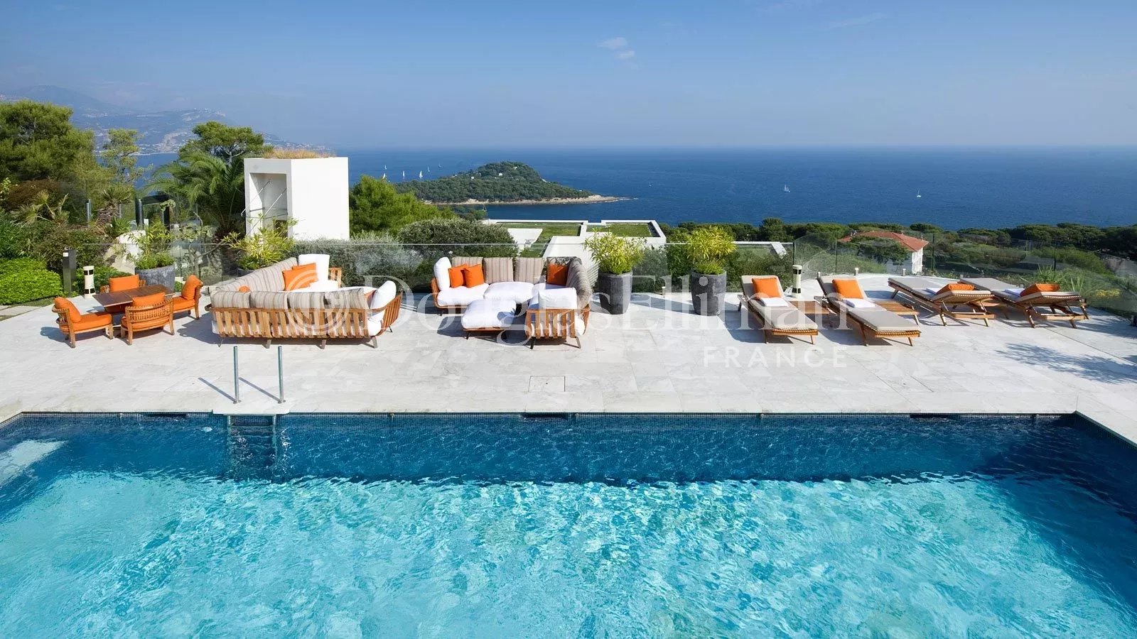 Les 7 suites, décorées dans un style néo-classique avec des touches modernes, offrent toutes une vue sur la mer, une salle de bain attenante et une terrasse privée. La propriété est équipée d'une grande piscine extérieure avec un fond ajustable en hauteur, d'un bassin de nage intérieur, d'une salle de sport et d'un spa. Tout est conçu pour vous offrir un cadre de vie splendide et un confort absolu, avec des vues inoubliables sur la Côte d'Azur.