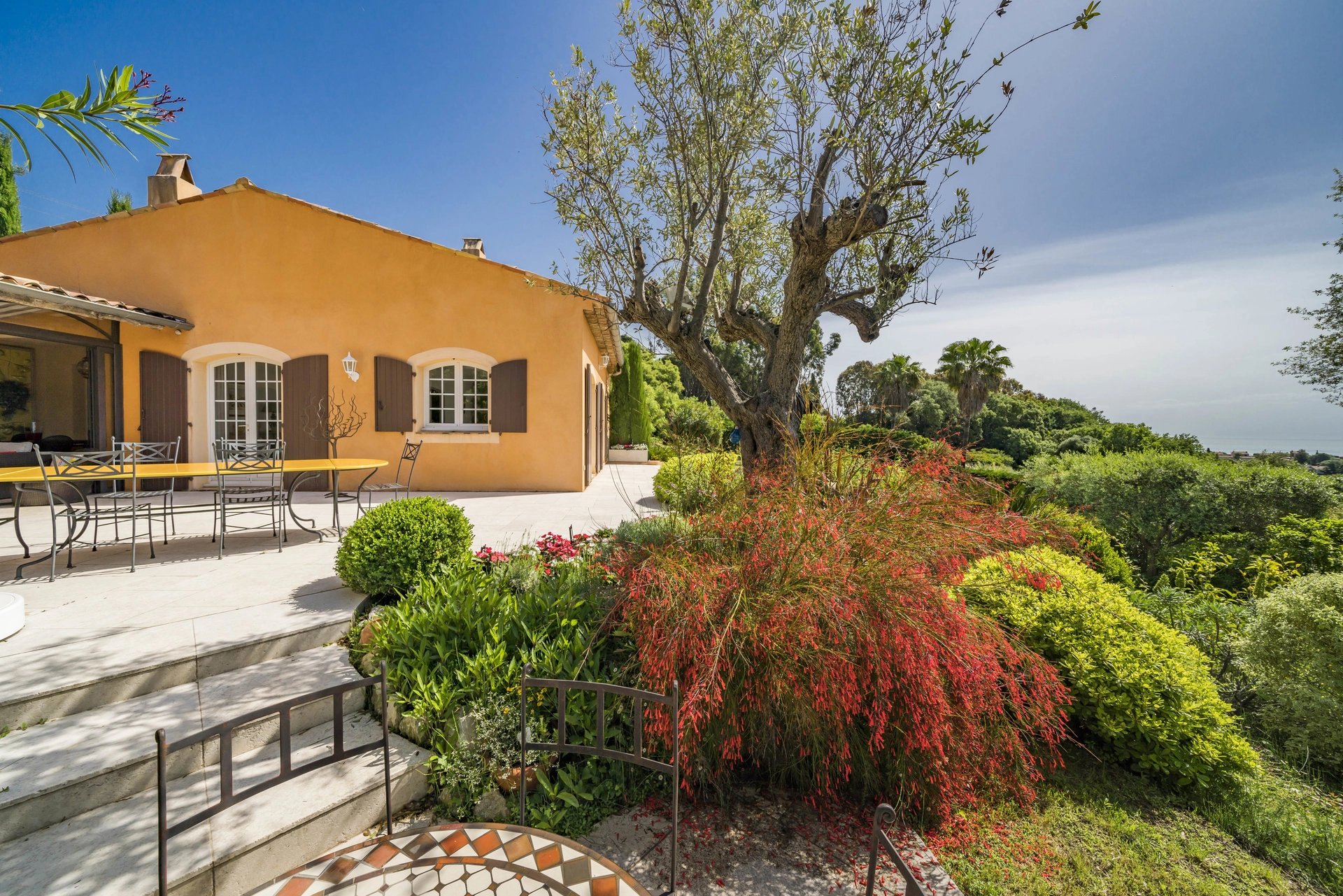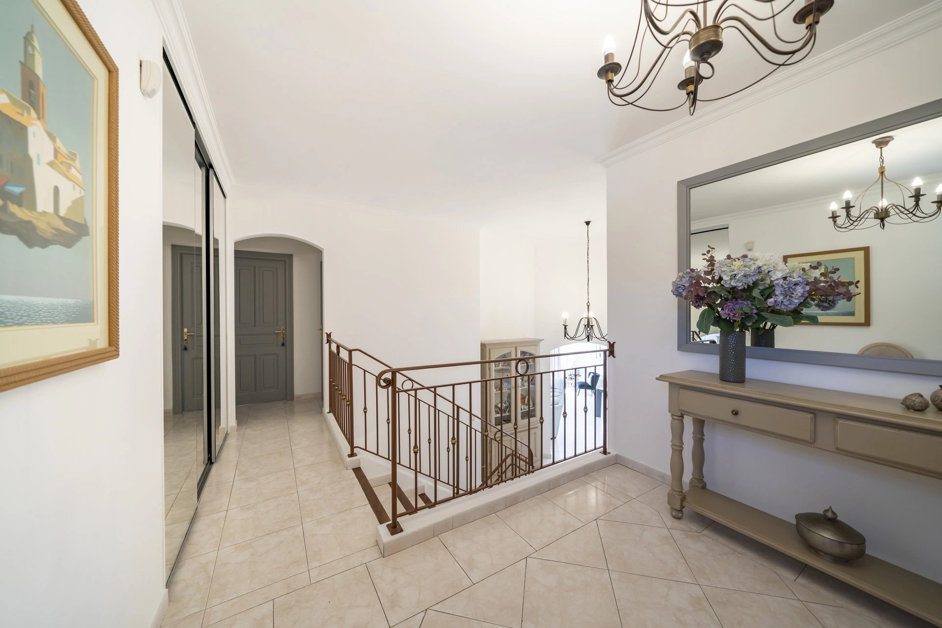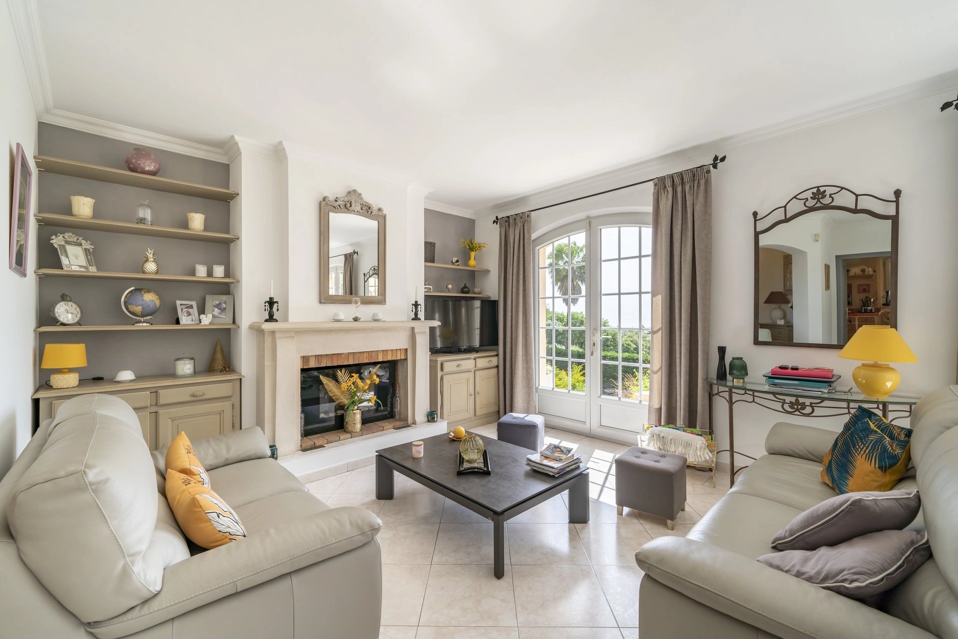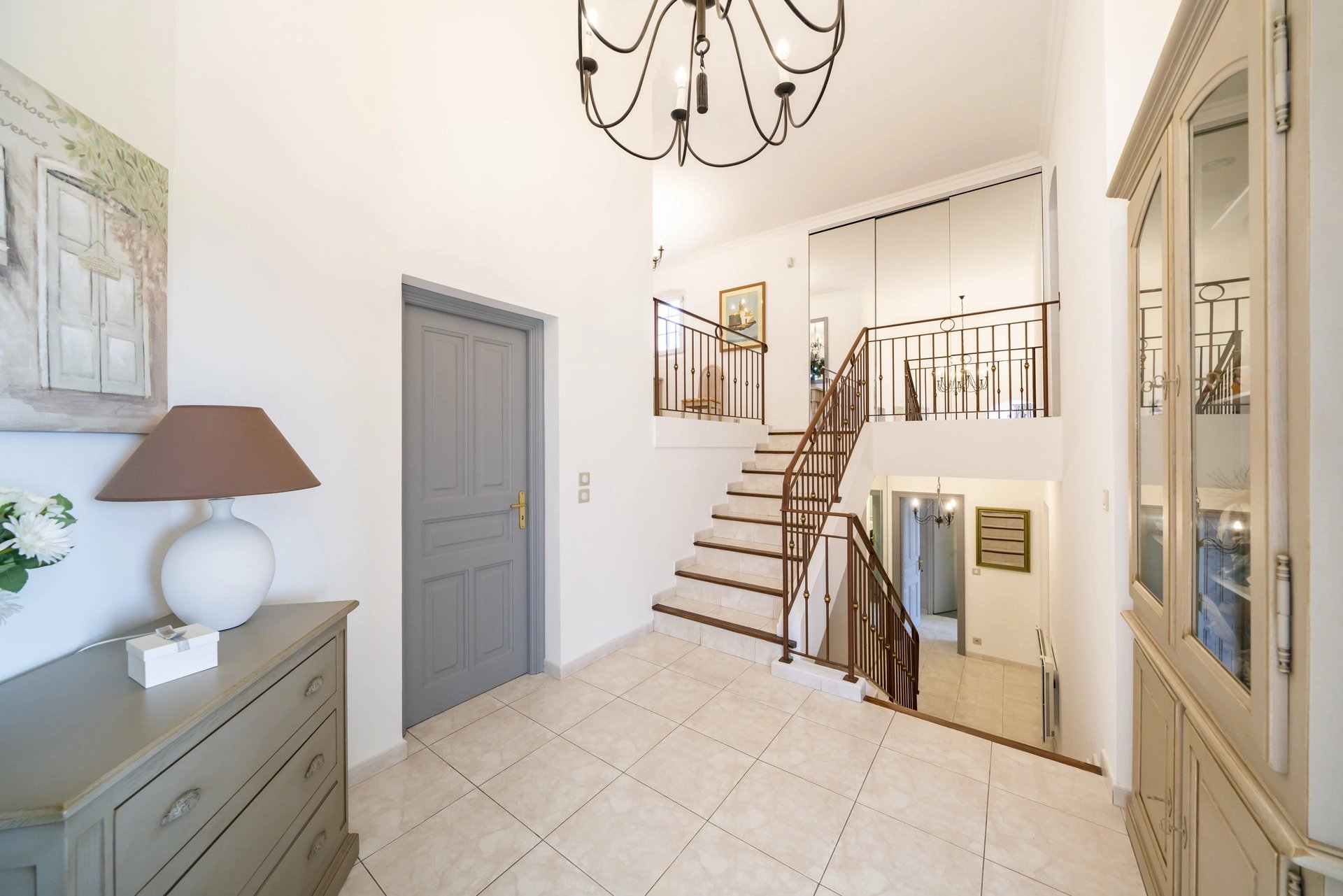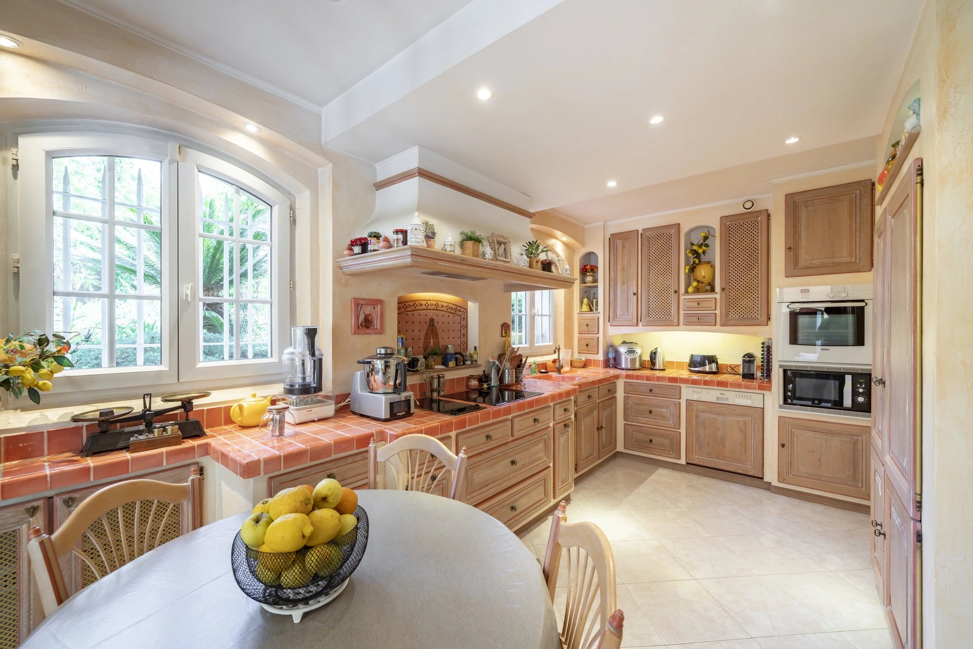 Dans un quartier résidentiel et très recherché, splendide villa de style provençal de +/- 202m² exposée Sud et Est bénéficiant d'une magnifique vue mer. Implantée sur un terrain de 1550 m² joliment complanté(essences méditerranéennes et arbres fruitiers) agrémenté d'une piscine, d'un terrain de pétanque, de plusieurs terrasses et de nombreux emplacements de stationnement, cette villa sans aucun vis à vis est en excellent état intérieur et extérieur. La maison principale comprend une entrée une chambre avec sa salle d'eau et un wc indépendant. Quelques marches mènent à un spacieux séjour - salon avec cheminée et à une grande cuisine dînatoire totalement équipée, enfin un demi-niveau plus bas on retrouve deux chambres de maître (une avec salle d'eau douche italienne et wc et l'autre avec salle de bains et wc). Une véranda aménagée en salon d'été permet l'accès à un deux pièces indépendant offrant sur deux niveaux un salon, une chambre, une salle d'eau avec wc. Une grande buanderie, un espace en sous-sol d'environ 120m² avec de nombreux rangements un garage double pour voitures côte à côte, la climatisation réversible, un adoucisseur d'eau, un système d'alarme et de vidéosurveillance, portail automatique et de nombreuses autres prestations intérieures et extérieures de qualité contribuent au grand confort de cette villa.