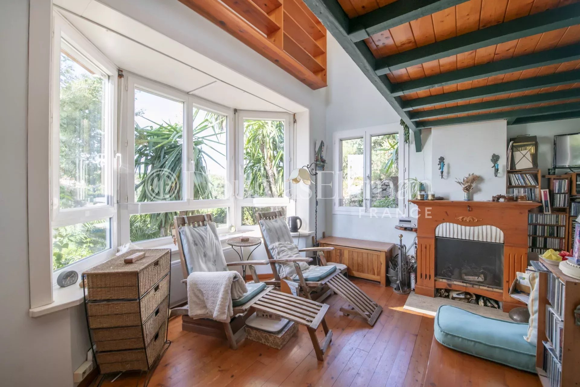 Cette villa familiale exposée sud, sur deux niveaux de 182m2, comprend un séjour, une cuisine, cinq chambres, quatre salles de bains, un bureau, un salon avec cheminée et garages.