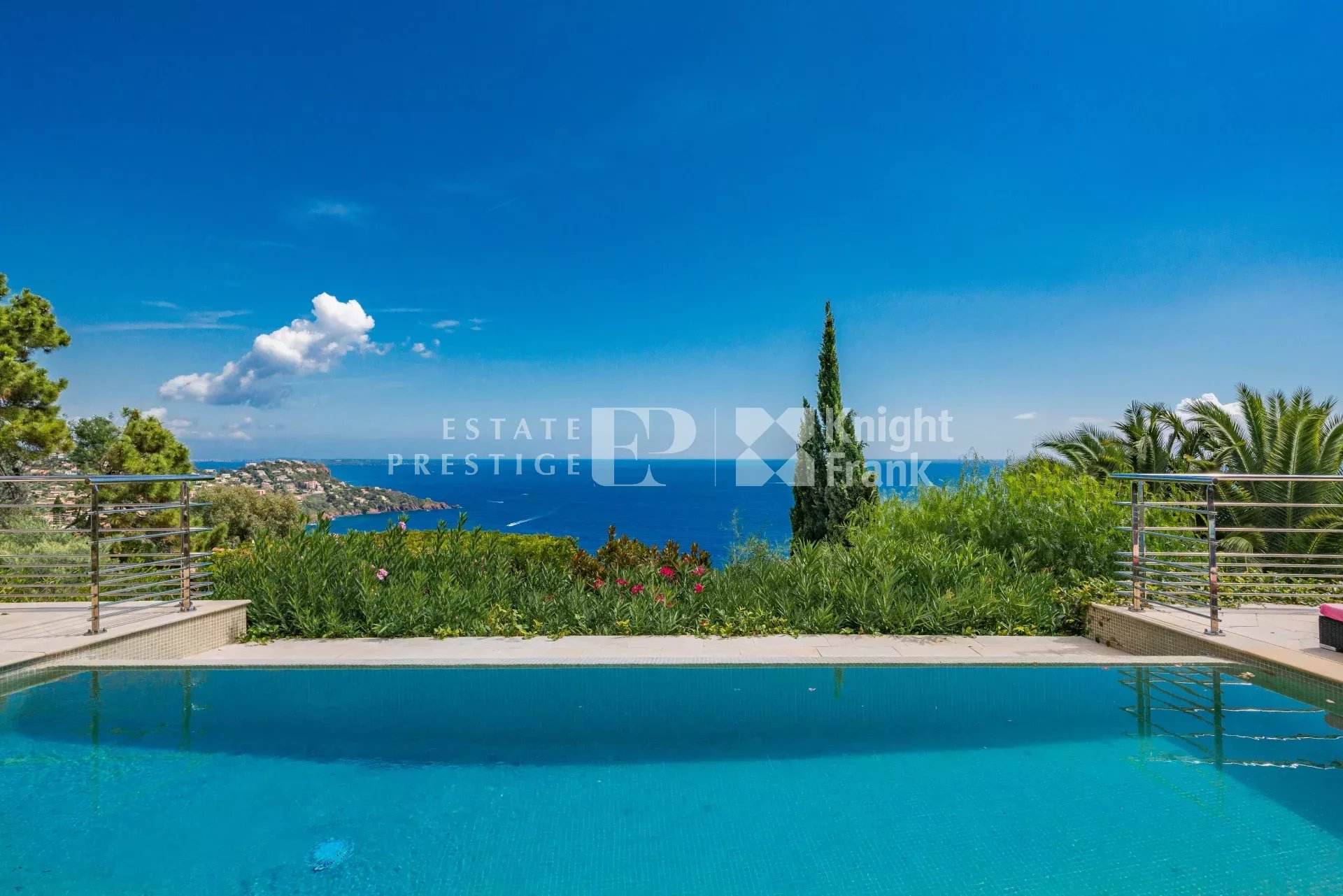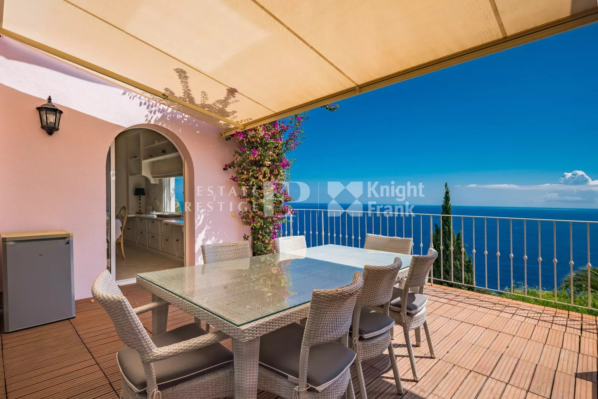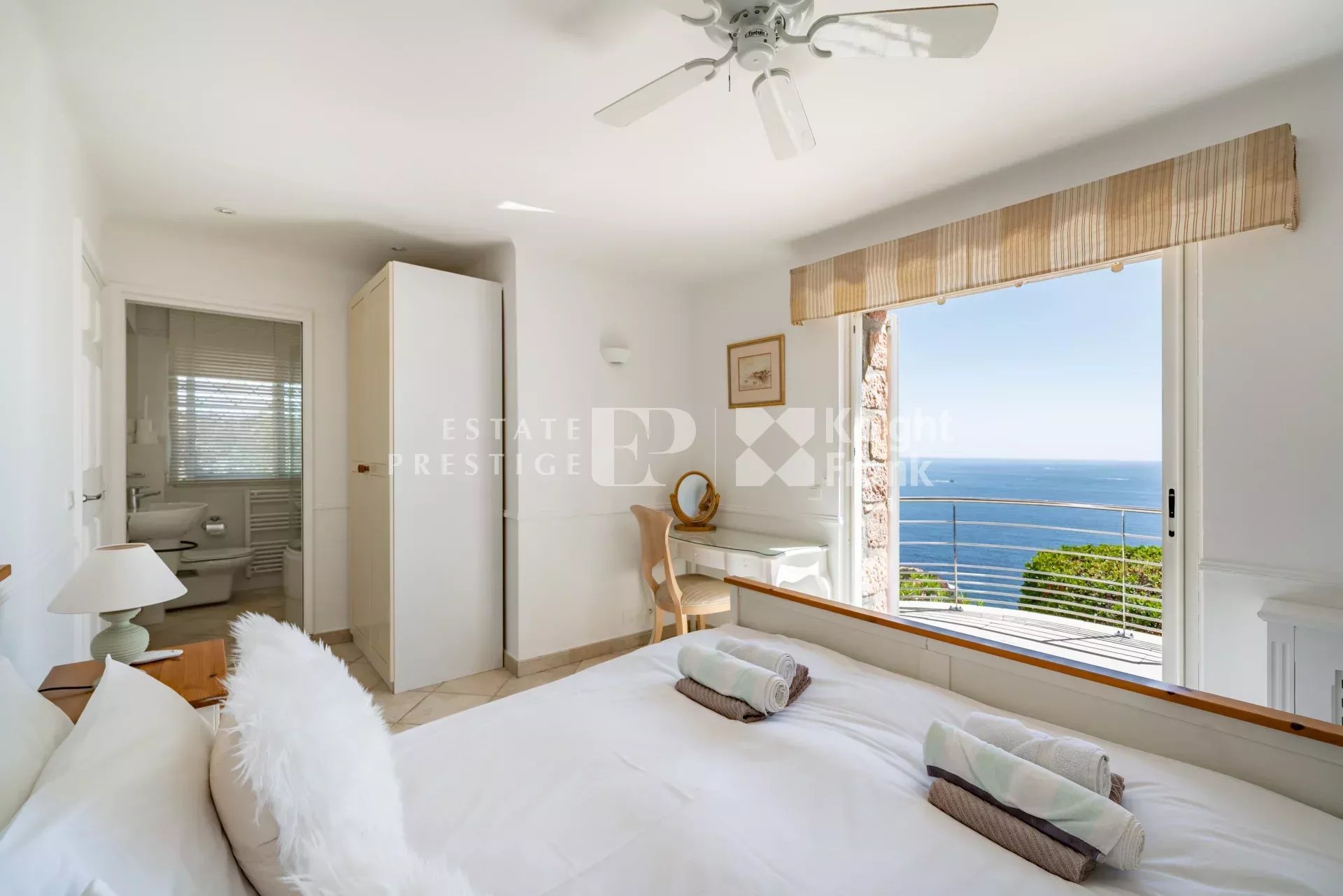 Le salon ouvert, doté d'une cheminée, ainsi que la salle à manger donnnt sur une terrasse spacieuse. La cuisine est entièrement équipée. La chambre principale climatisée a un dressing et une salle de bains attenante. Le niveau de la piscine comprend trois chambres supplémentaires avec vue mer, chacune avec sa salle de bains.