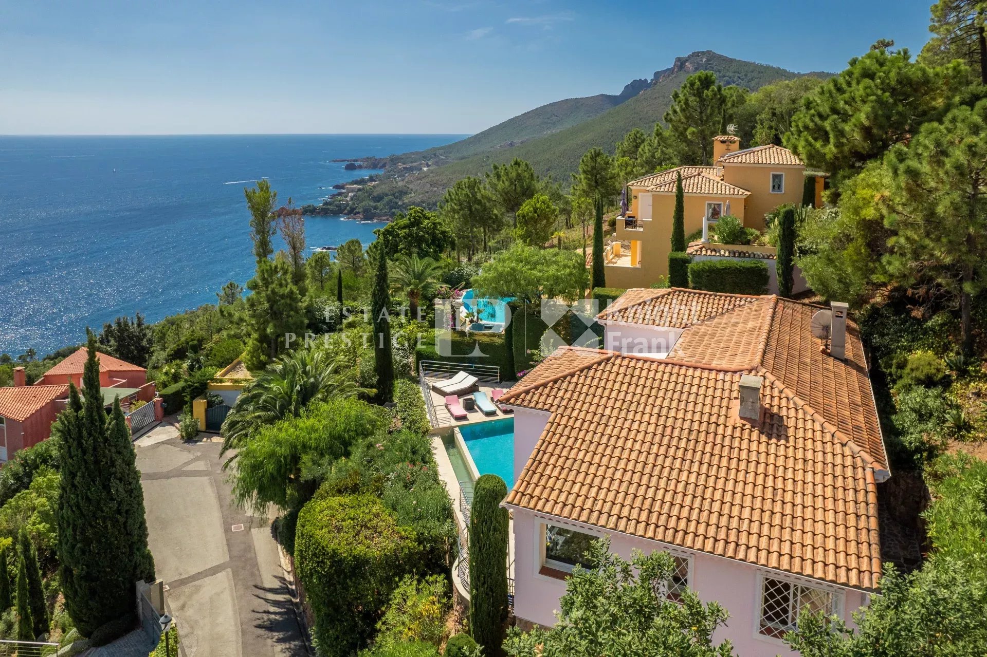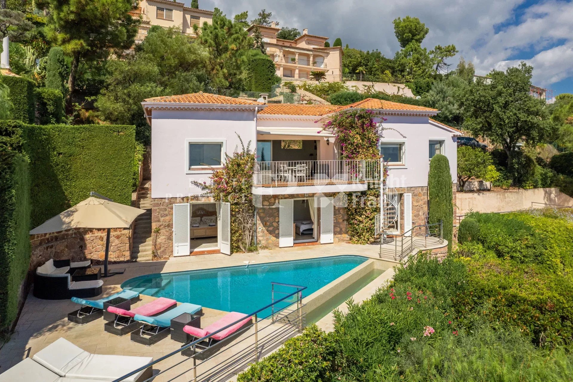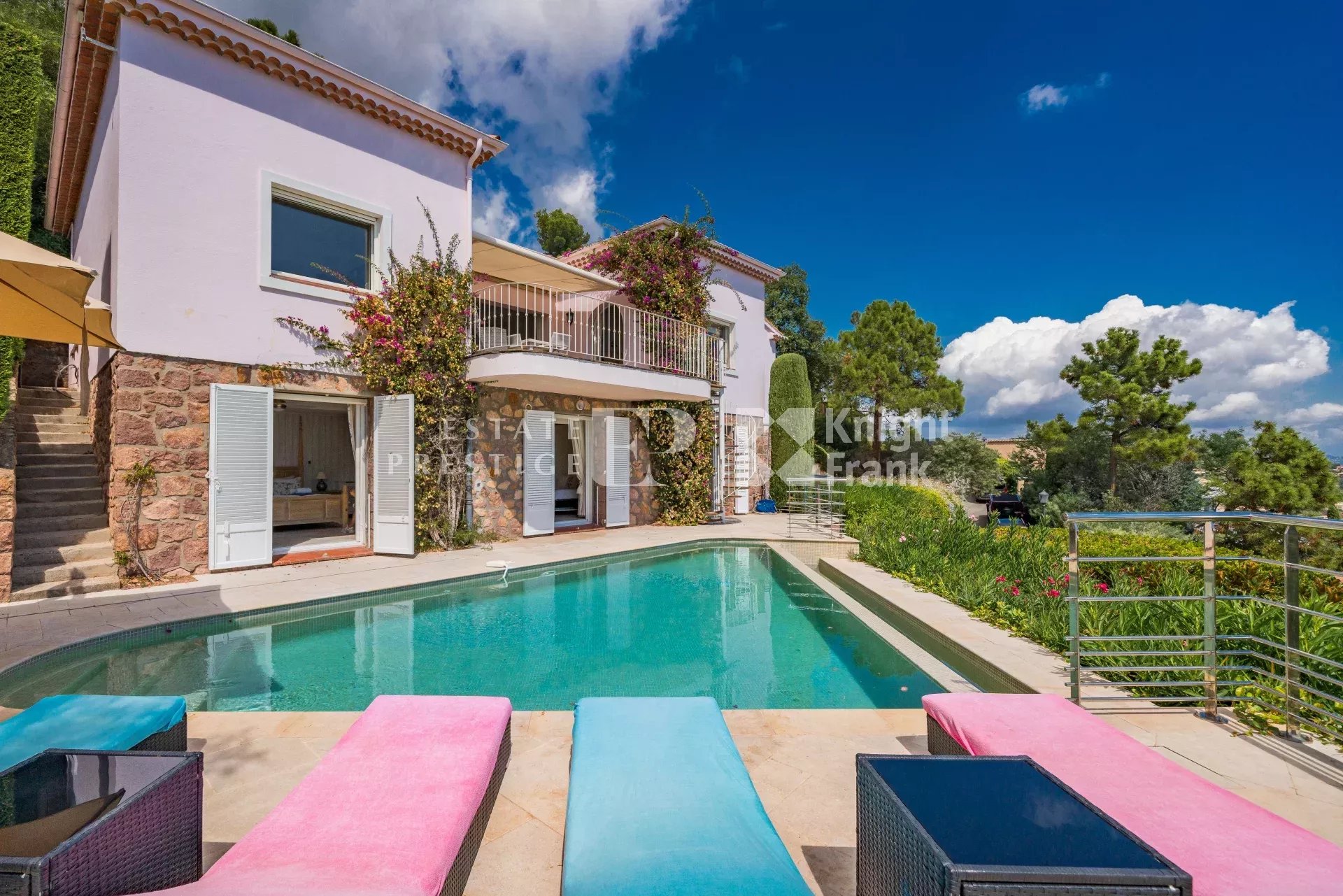 Le salon ouvert, doté d'une cheminée, ainsi que la salle à manger donnnt sur une terrasse spacieuse. La cuisine est entièrement équipée. La chambre principale climatisée a un dressing et une salle de bains attenante. Le niveau de la piscine comprend trois chambres supplémentaires avec vue mer, chacune avec sa salle de bains.