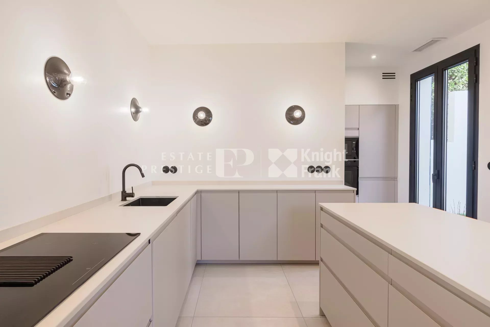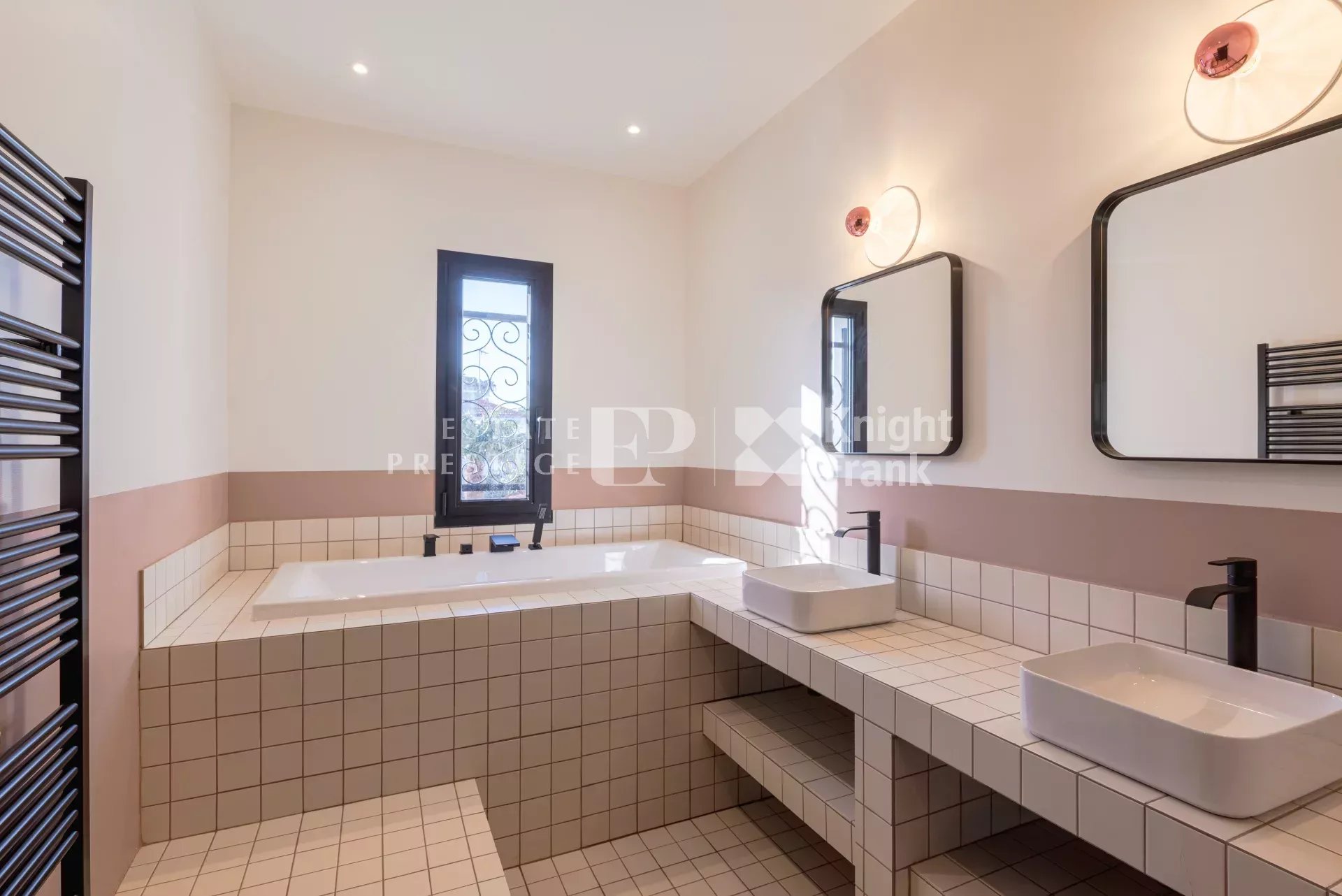 À l’extérieur, le terrain d’environ 700 m² est un véritable havre de paix. La piscine, entourée de verdure, invite à la détente et aux baignades ensoleillées. Le garage et les espaces de stationnement complètent ce bien d’exception, offrant praticité et confort au quotidien. Exposée plein sud, cette villa bénéficie d’une luminosité optimale tout au long de la journée.