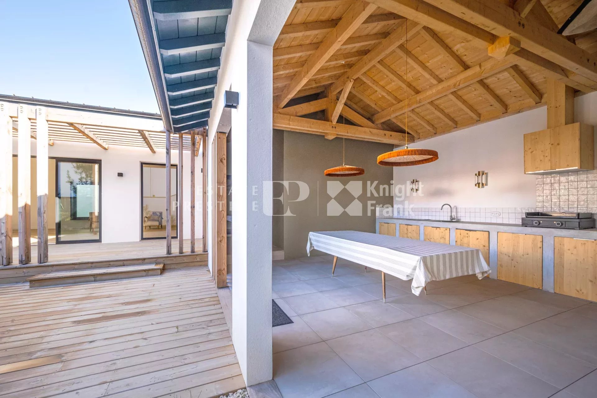 Une vaste pièce de vie lumineuse, où l’espace et la convivialité se rencontrent. La cuisine, entièrement équipée, ravira les amateurs de gastronomie avec ses équipements modernes et son agencement fonctionnel. Une belle terrasse s'ouvre sur le jardin, offrant un cadre idyllique pour vos repas en plein air ainsi qu’une terrasse couverte avec cuisine équipée.