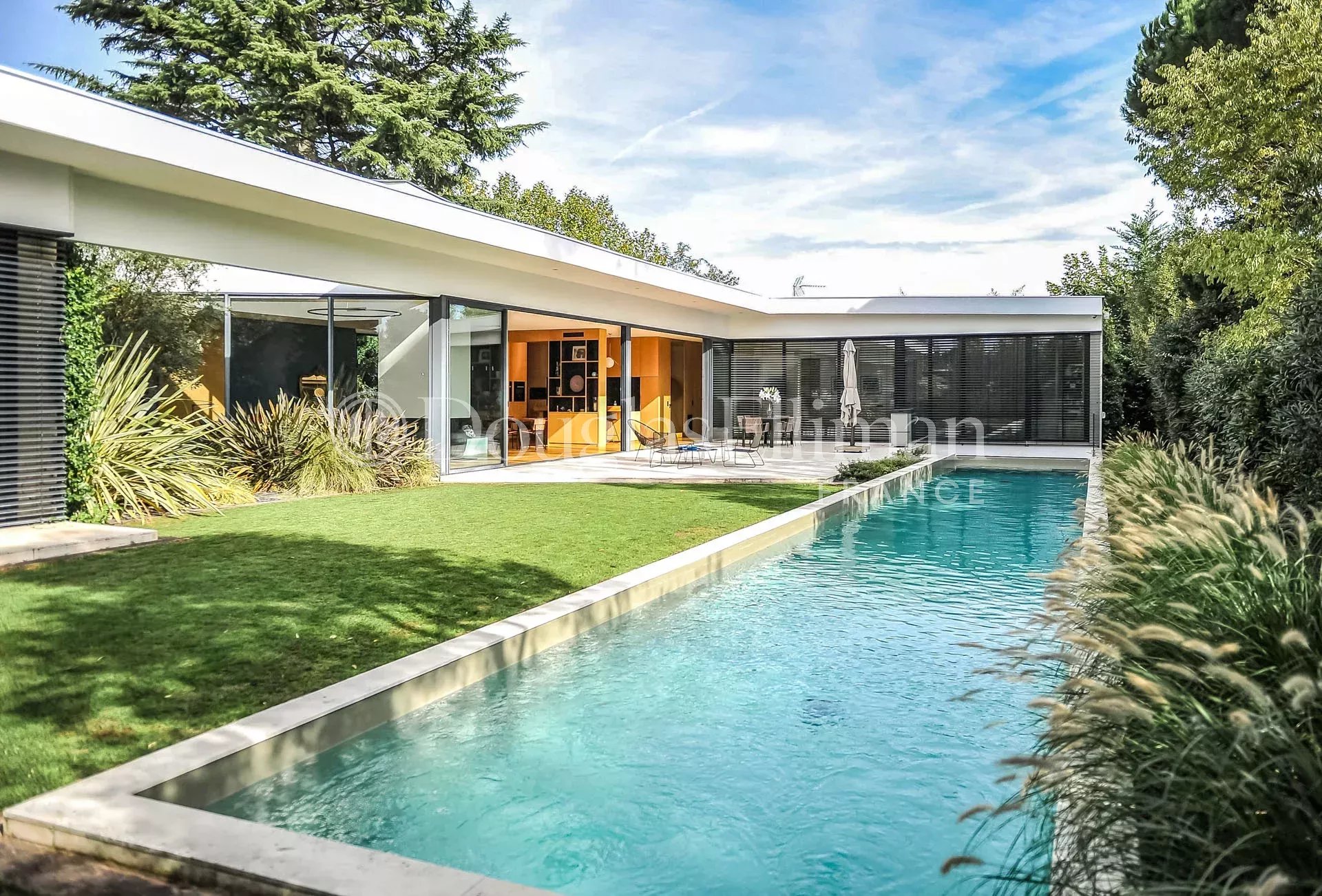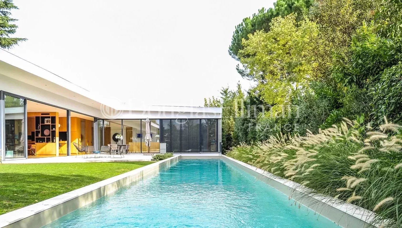 Denne moderne luksusvillaen ligger i de elegante, velstående forstedene til Bordeaux, og gjenspeiler eiernes interesse for nye trender innen arkitektur.