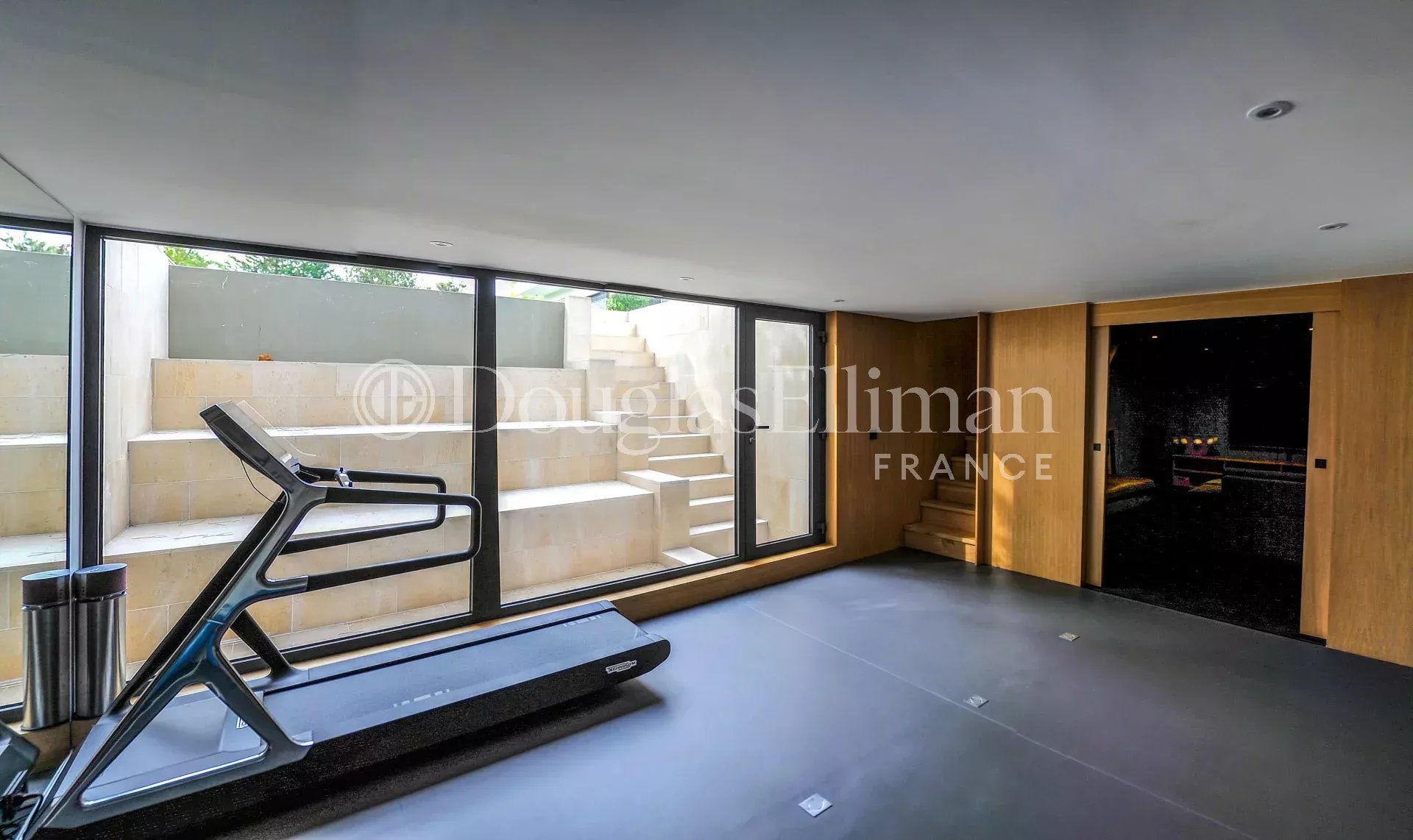 Hovedsoverommet, som vender ut mot terrassen, er utformet som en hotellsuite, med et stort bad og dobbelt omkledningsrom. 4 soverom med eget bad og et kontor med egen inngang gir plass og komfort for hele familien. De bemerkelsesverdige fasilitetene: kino, treningsstudio, badstue osv. gir denne villaen en luksuriøs karakter som er sjelden i området.