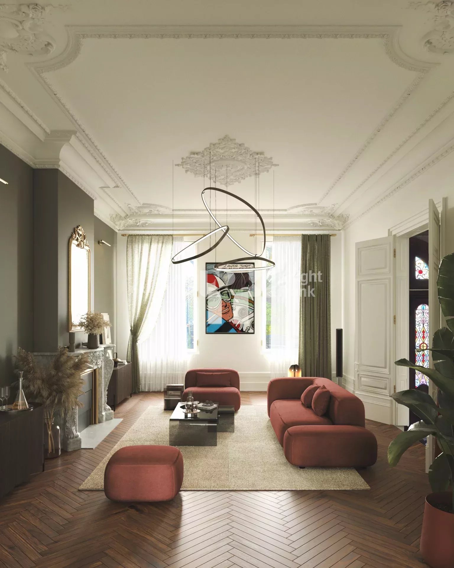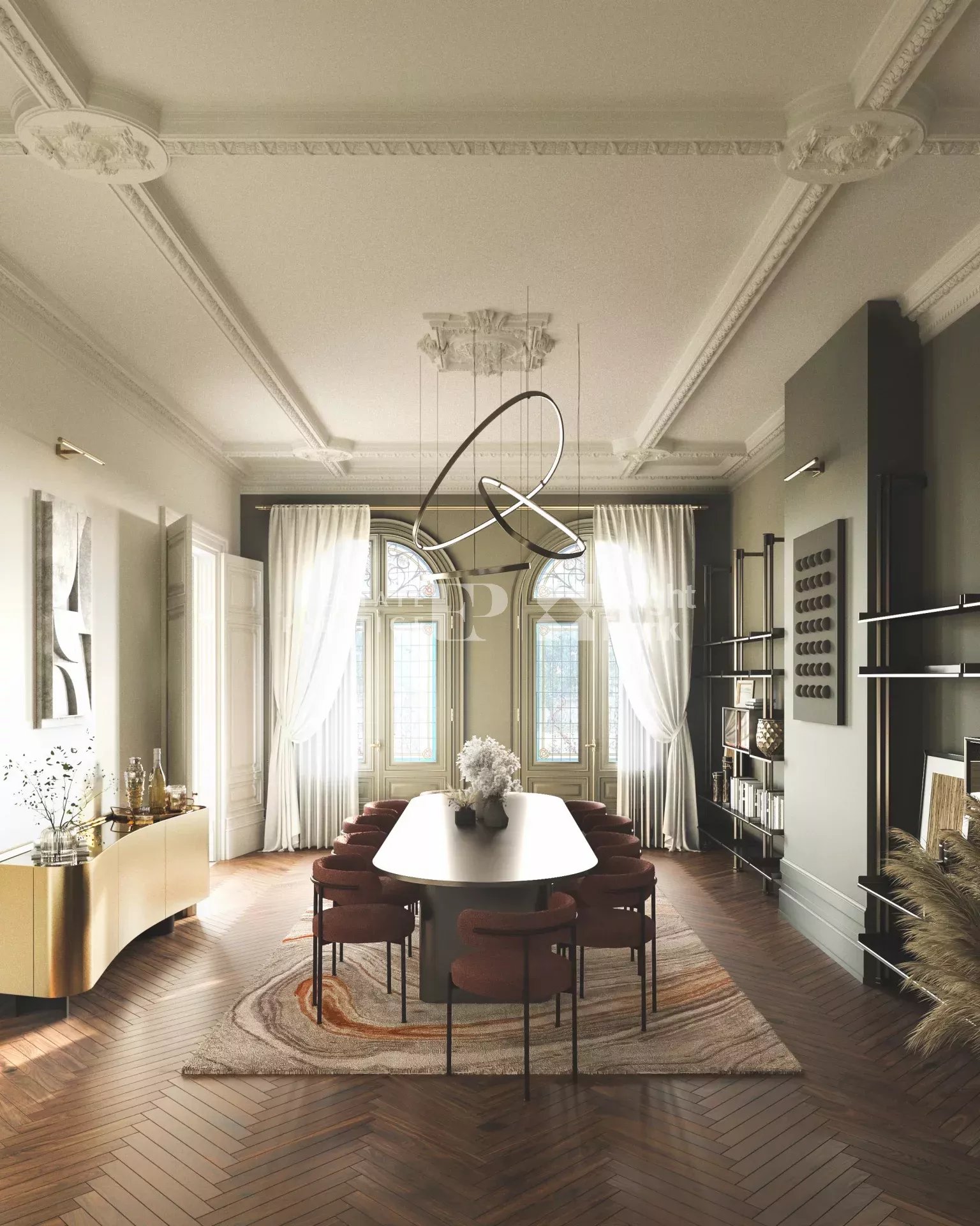Dès l’entrée, un vaste hall vous accueille et mène à un salon lumineux et une salle à manger ouvrant sur une terrasse intime. Un escalier d’époque dessert les étages supérieurs, où une suite parentale occupe le premier étage, suivie de cinq chambres avec salles de bains réparties sur les deux étages suivants. Le dernier niveau offre un espace modulable, idéal pour une bibliothèque ou un bureau.