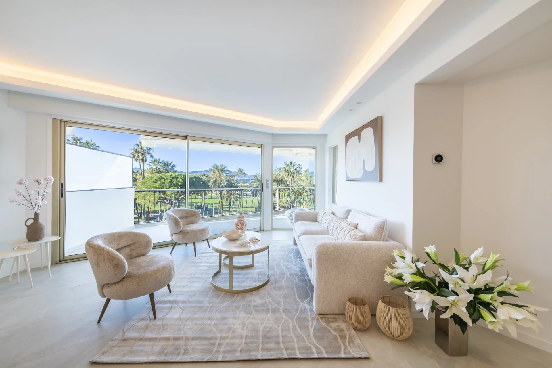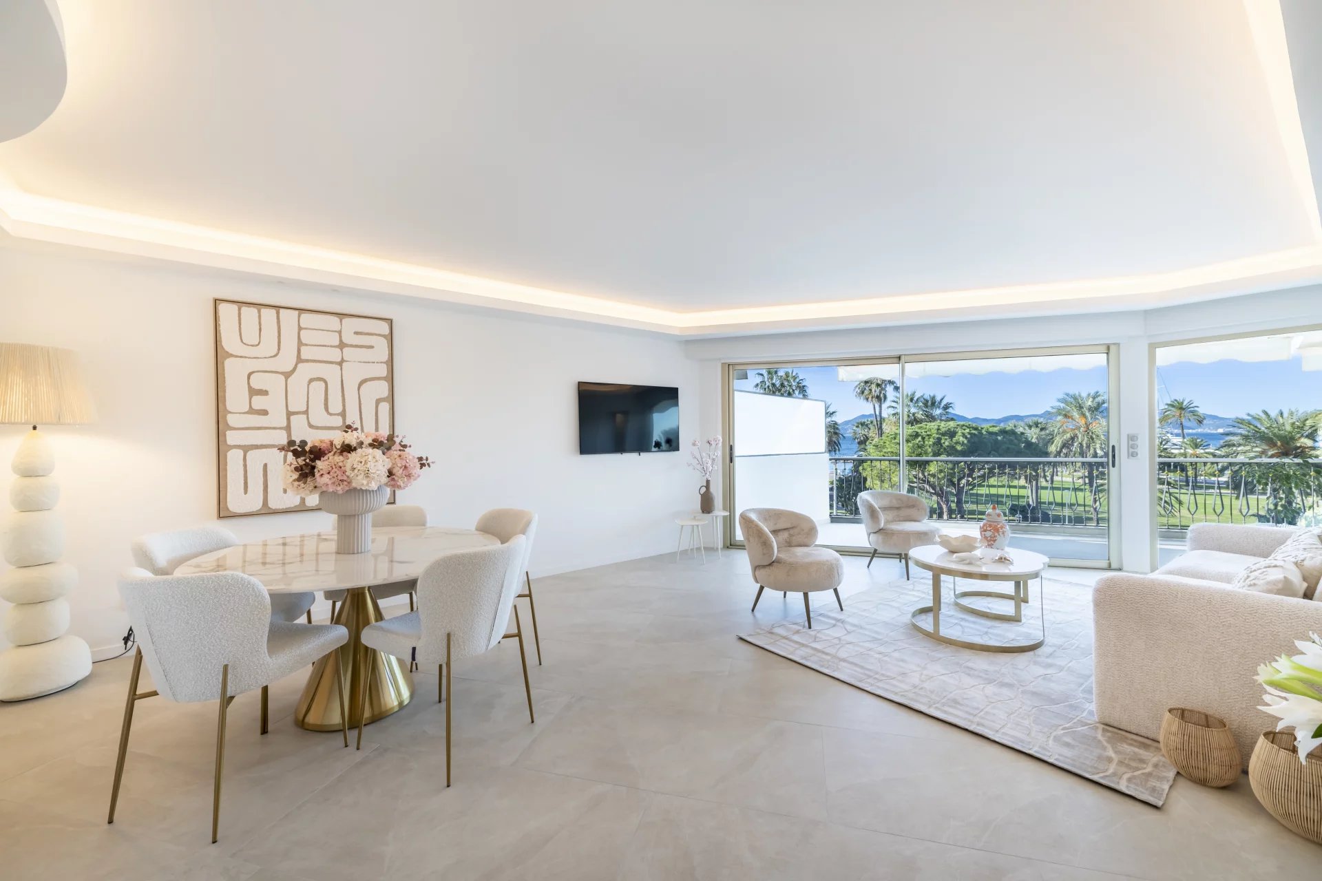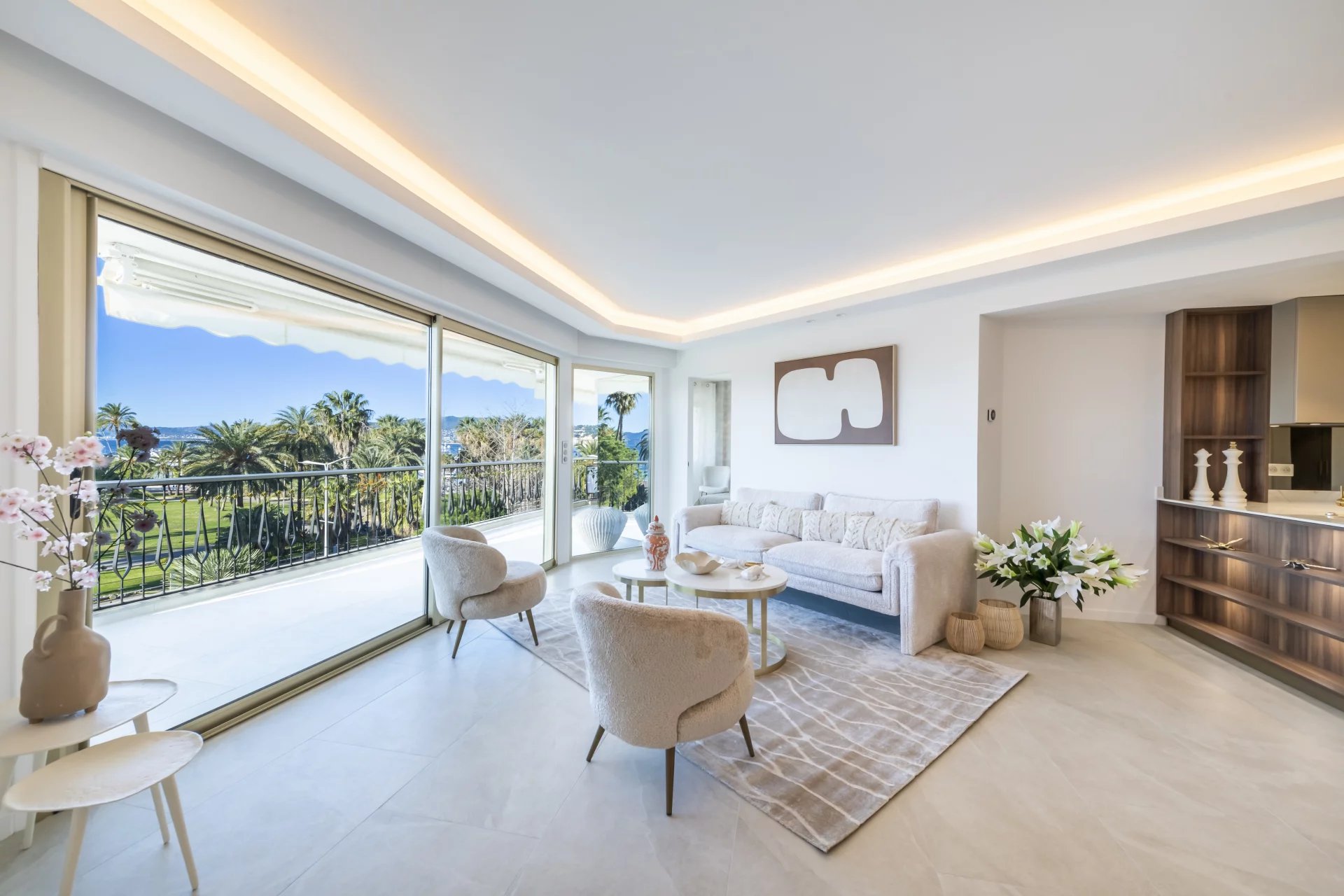 Denne praktfulle 3-romsleiligheten på 75 m2 ligger på den berømte boulevard de la Croisette og nær Port Canto, i en rolig luksusbolig med sikkerhetsvakt, og har en vakker, uhindret utsikt over havet og Esterel-åsene.
