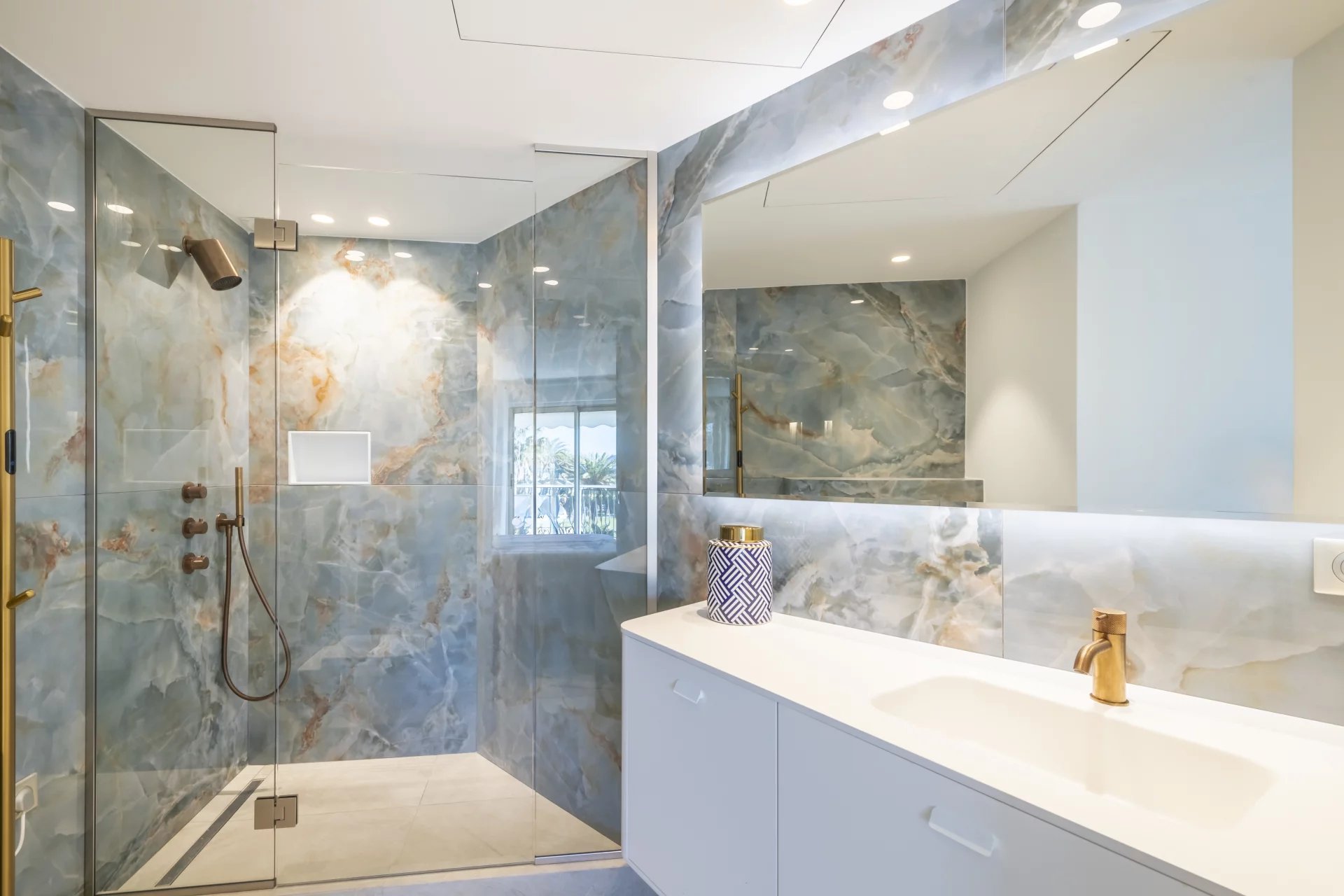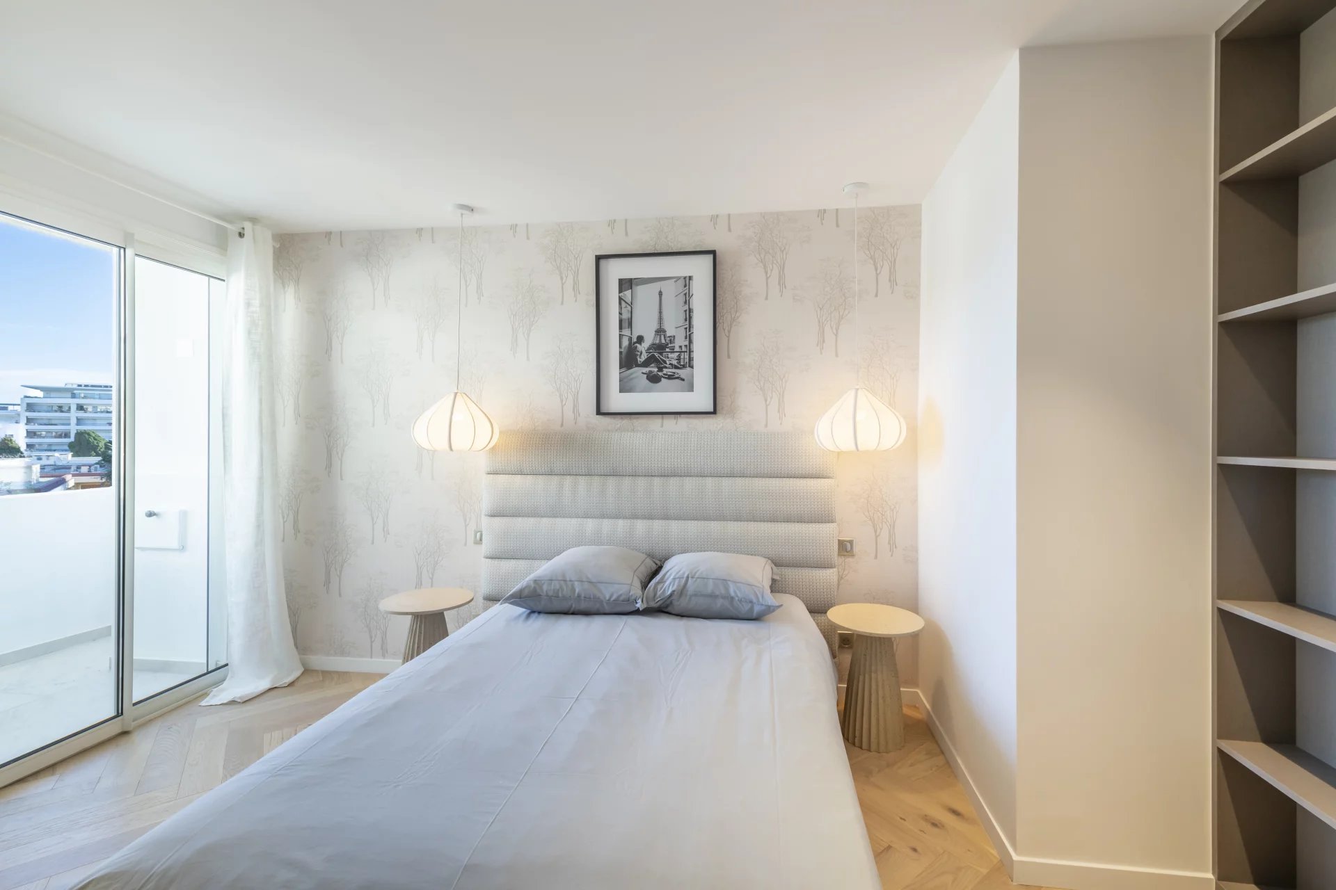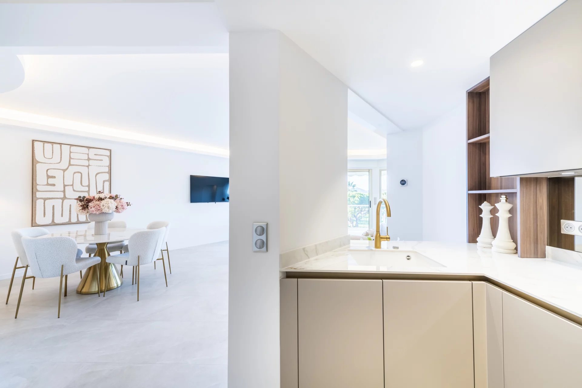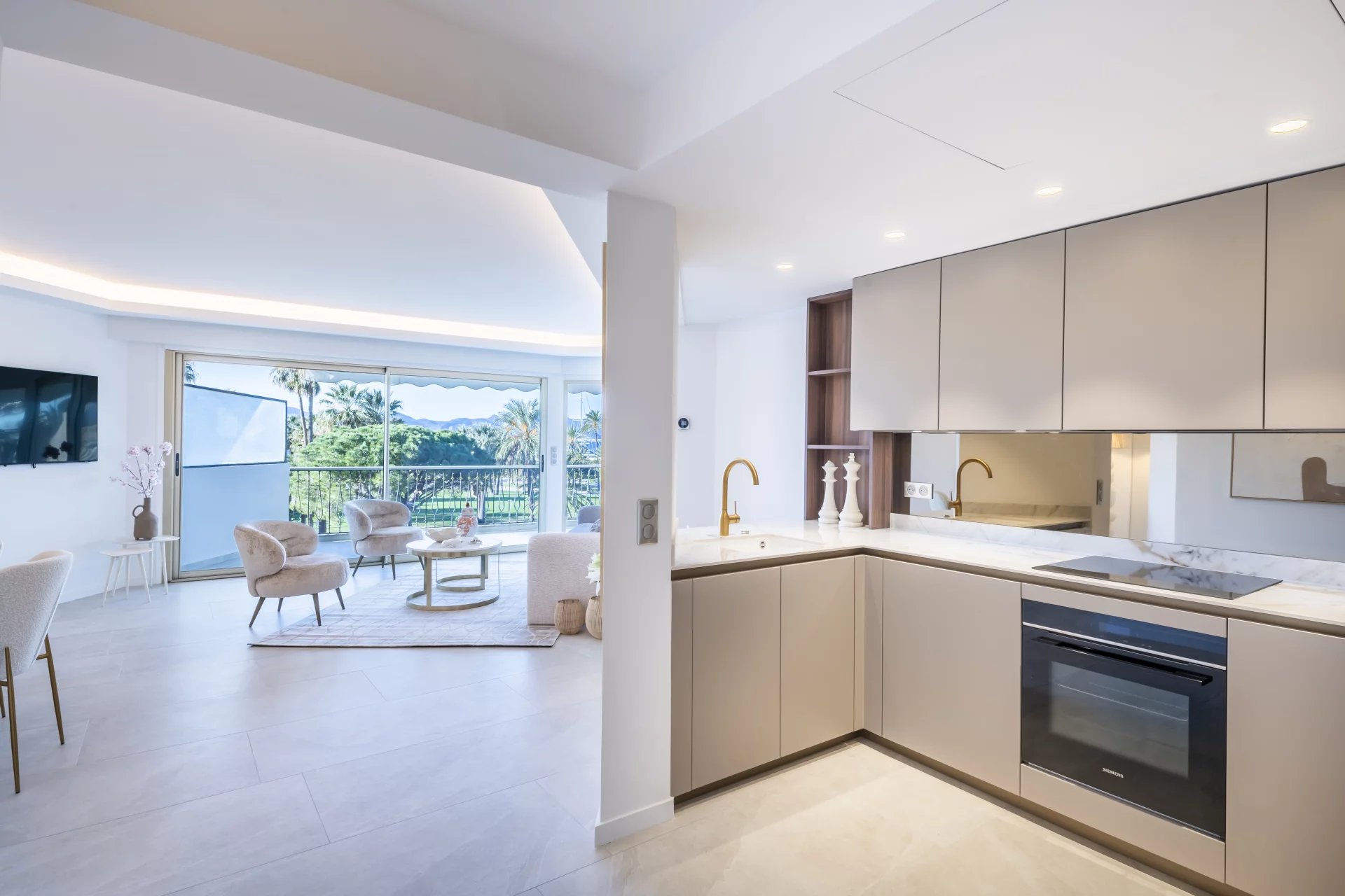 Denne praktfulle 3-romsleiligheten på 75 m2 ligger på den berømte boulevard de la Croisette og nær Port Canto, i en rolig luksusbolig med sikkerhetsvakt, og har en vakker, uhindret utsikt over havet og Esterel-åsene.