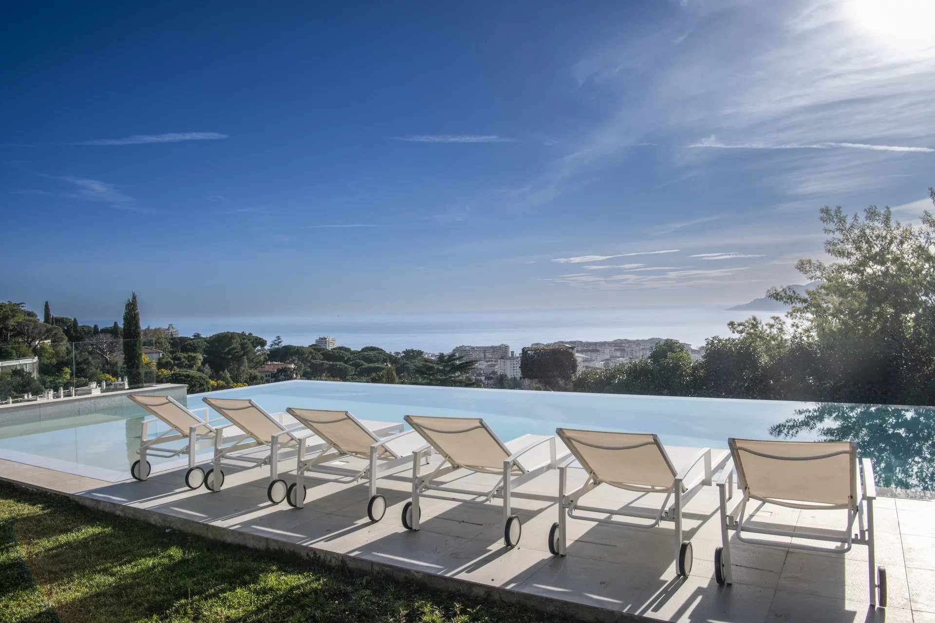 Denne moderne villaen på 473 m2 i Croix des Gardes er bygget over to plan og har fantastisk havutsikt og et evighetsbasseng med saltvann.