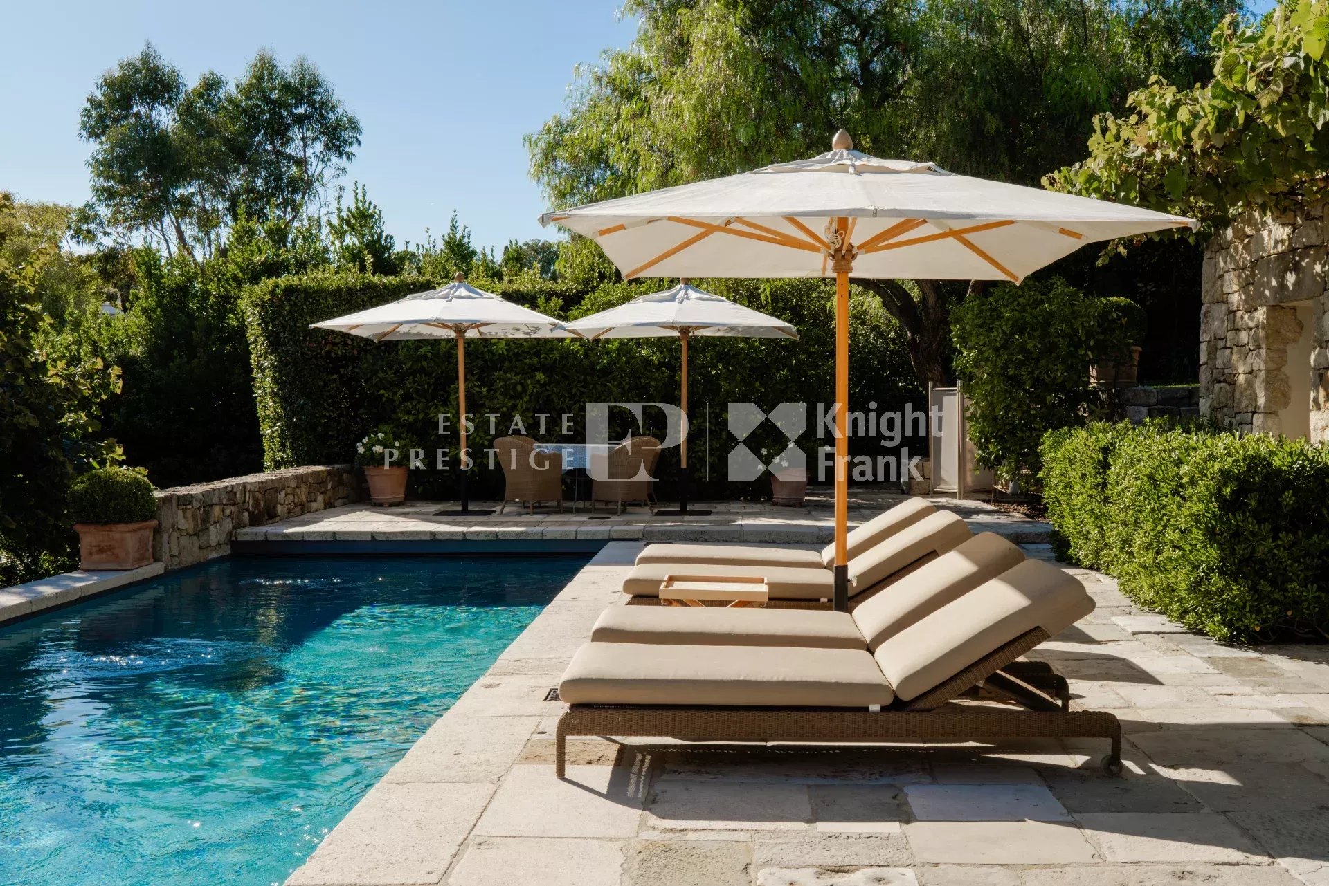 Nyt det 13,5x3,5 meter store oppvarmede bassenget, som har blitt fullstendig renovert og har et integrert deksel. Bassengområdet inkluderer også en vinpergola og god plass til solsenger, med en terrasse som gir en fantastisk 180° havutsikt som strekker seg fra Antibes til La Napoule. Eiendommen tilbyr fullstendig privatliv, uten bygninger eller naboer foran. En utendørs dusj og vakkert restaurerte steinterrasser forbedrer bassengområdet ytterligere.