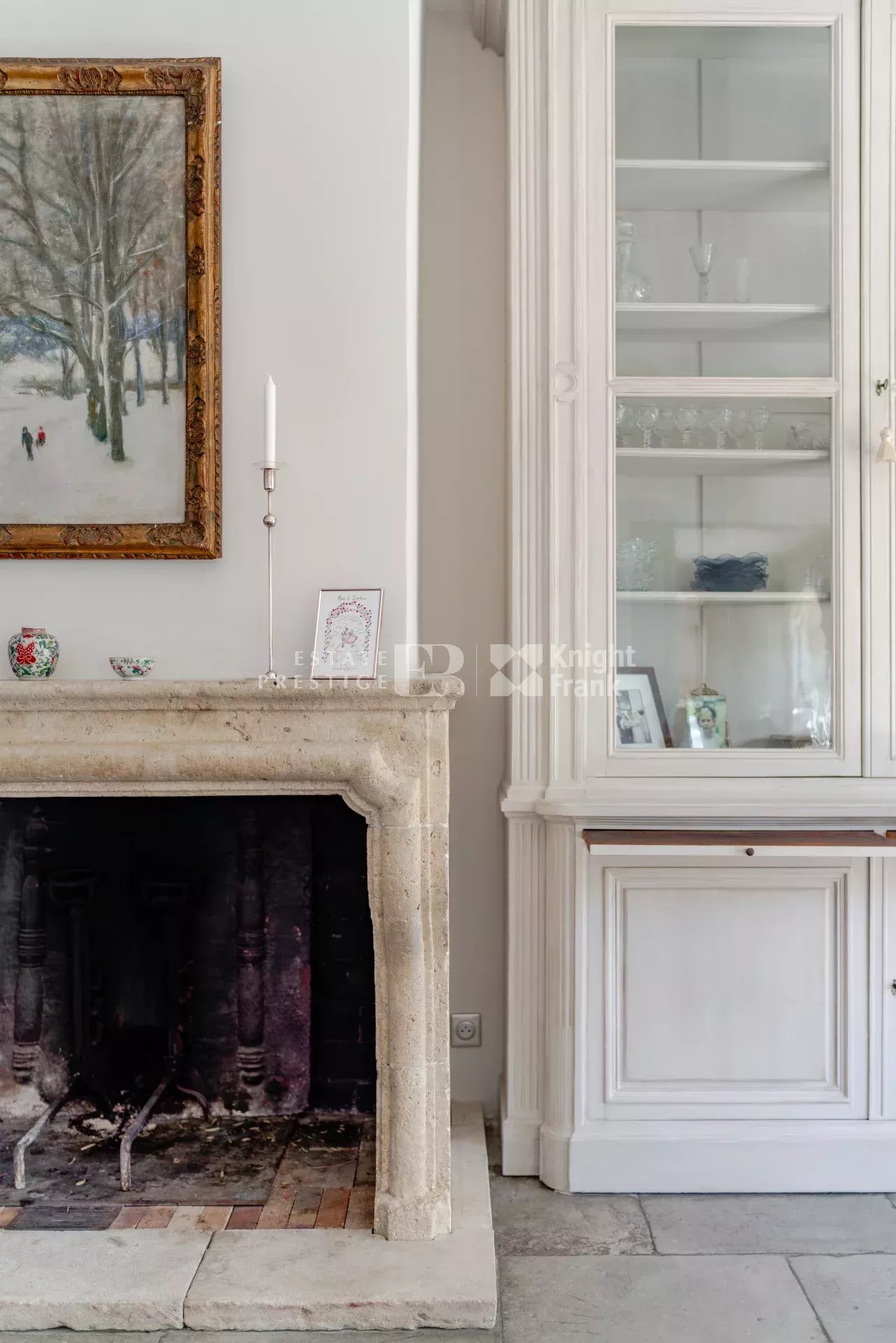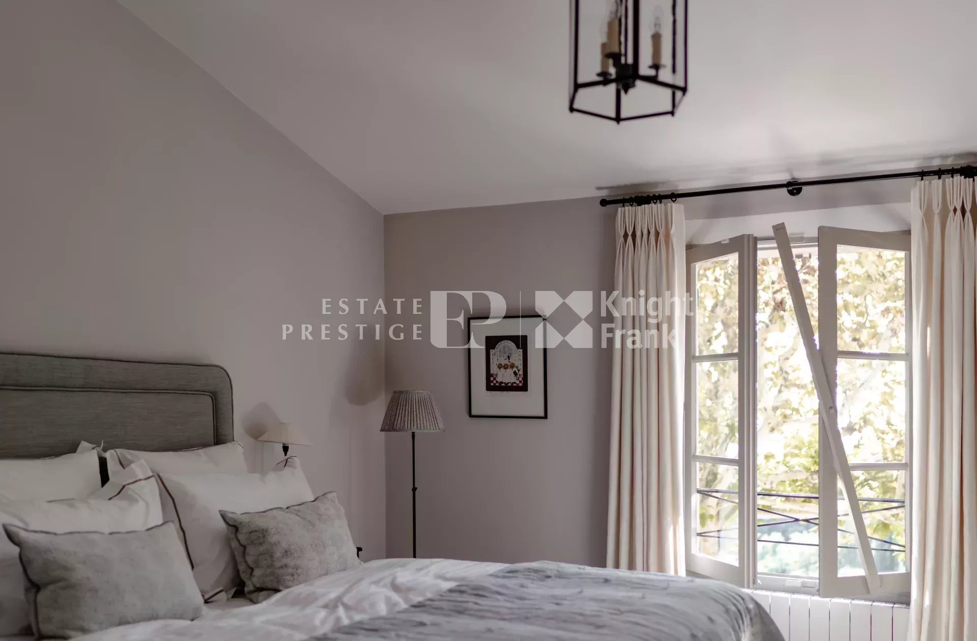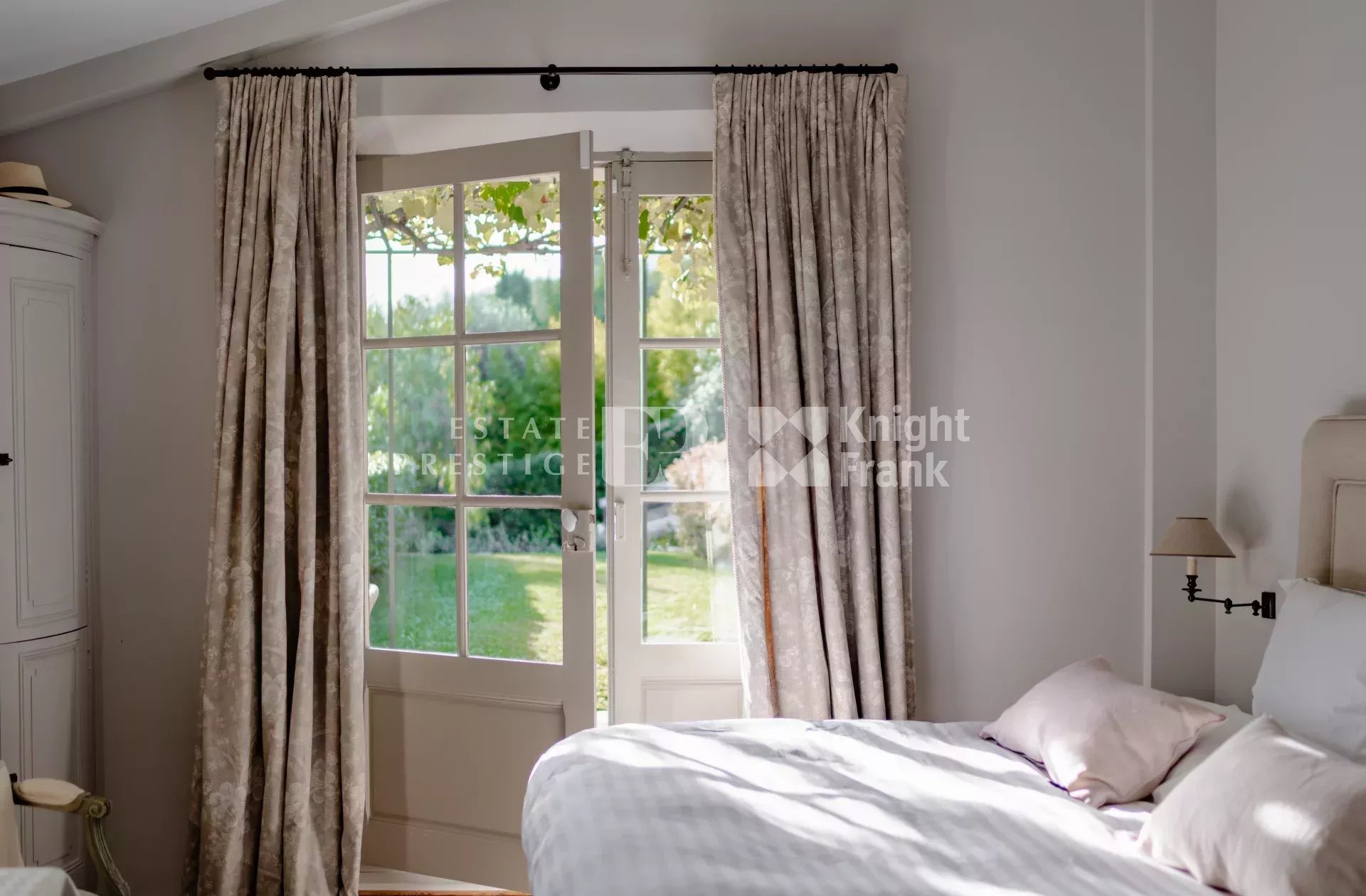 Inne i huset finner du fem soverom, hvorav ett i dag fungerer som bibliotek, to av soverommene har store klassiske åpne steinpeiser i samme stil som i hovedstuen, og alle soverommene har nytt klimaanlegg. Hvert soverom har sitt eget private bad, med oppvarmede steingulv, håndklestativ og elegante dusjarmaturer i engelsk stil. Det spesiallagde engelske de Vol landkjøkkenet er en kokkens drøm, med en stor midtøy, førsteklasses Miele-apparater, Lacanche-ovn og luksuriøse benkeplater i Jura-limestein. Alle oppholdsrommene har steingulv fra Pierre de Bourgogne fra 1400-tallet, og soverommene har antikke tregulv og snekkerbygde skap. Ekstra plass inkluderer et vaskerom, vinkjeller og en romslig hagesalong med en fast montert hjørnesofa.