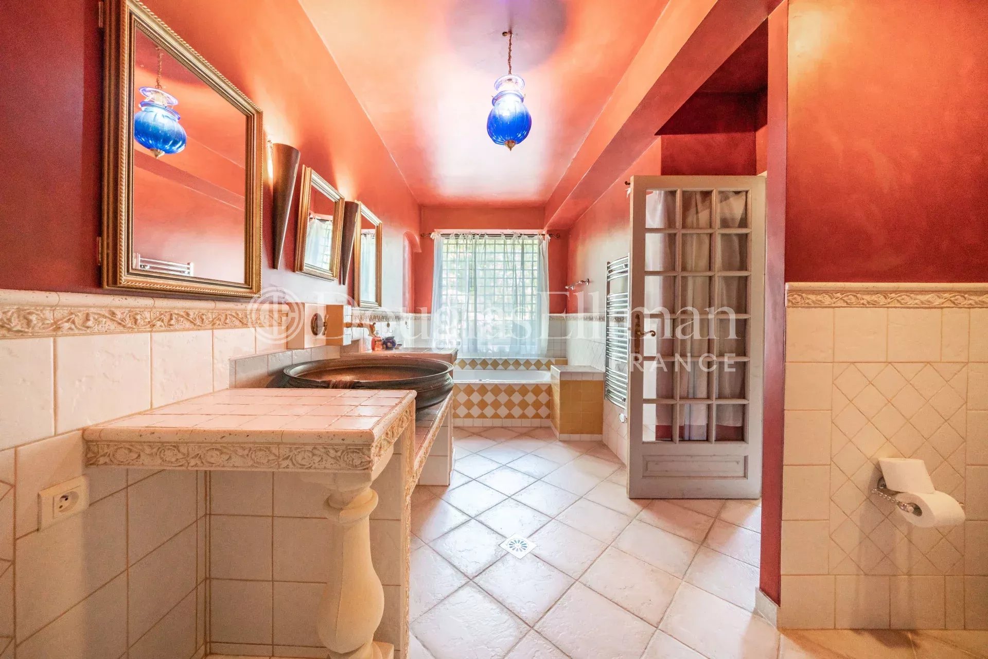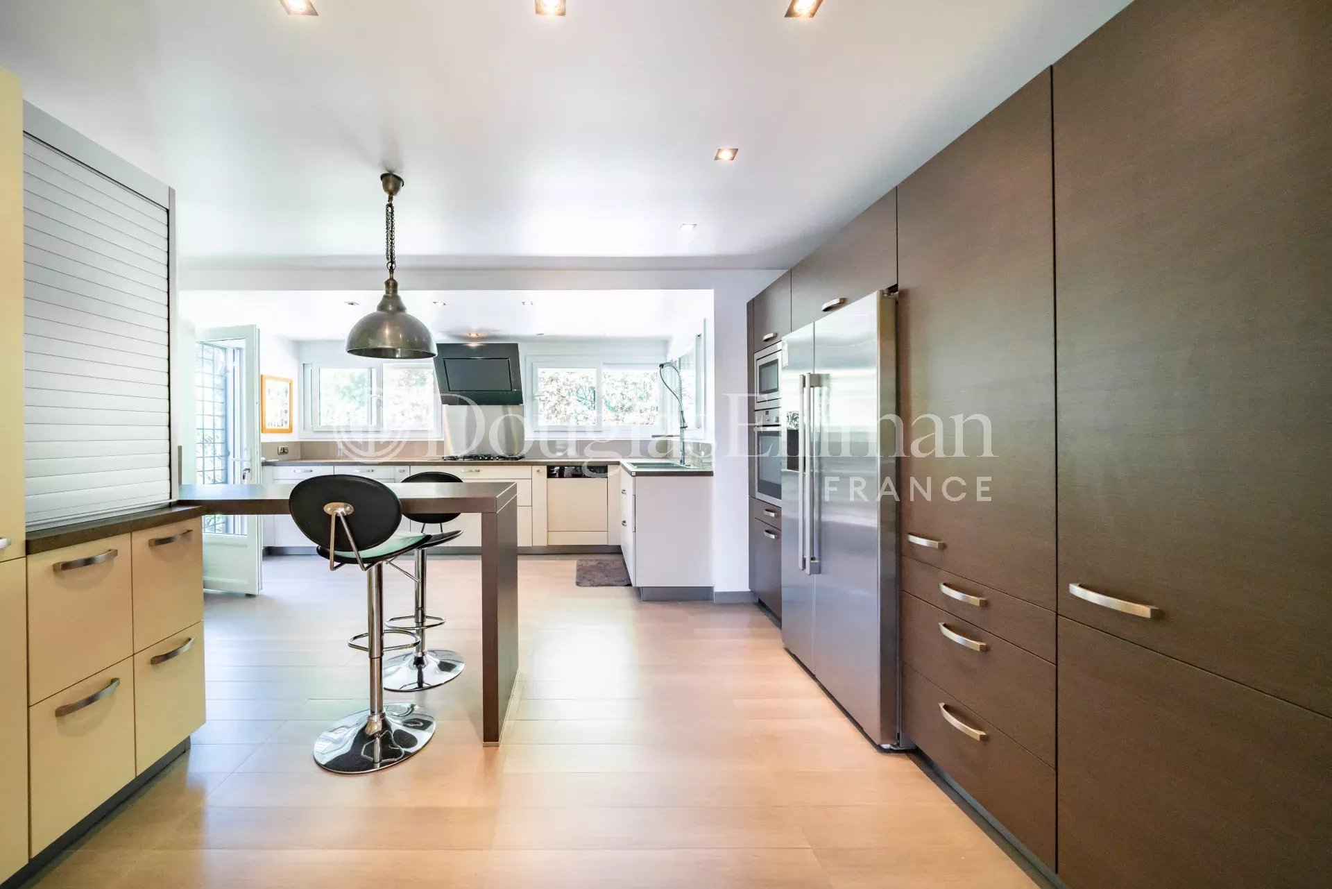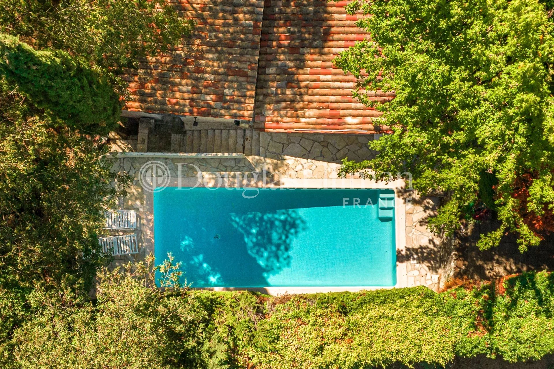 Beliggende i en moden og privat hage med en terrasse som går langs hele fronten av eiendommen. Flere salonger og spisestue, basseng, carport og AC overalt.