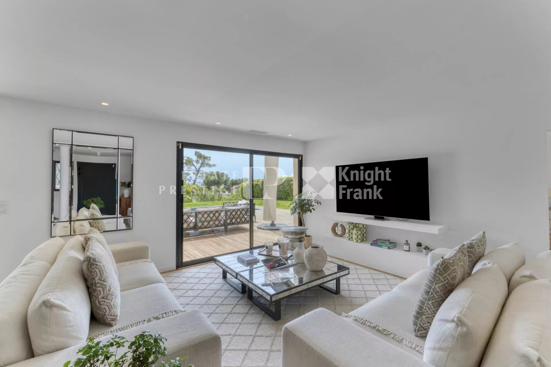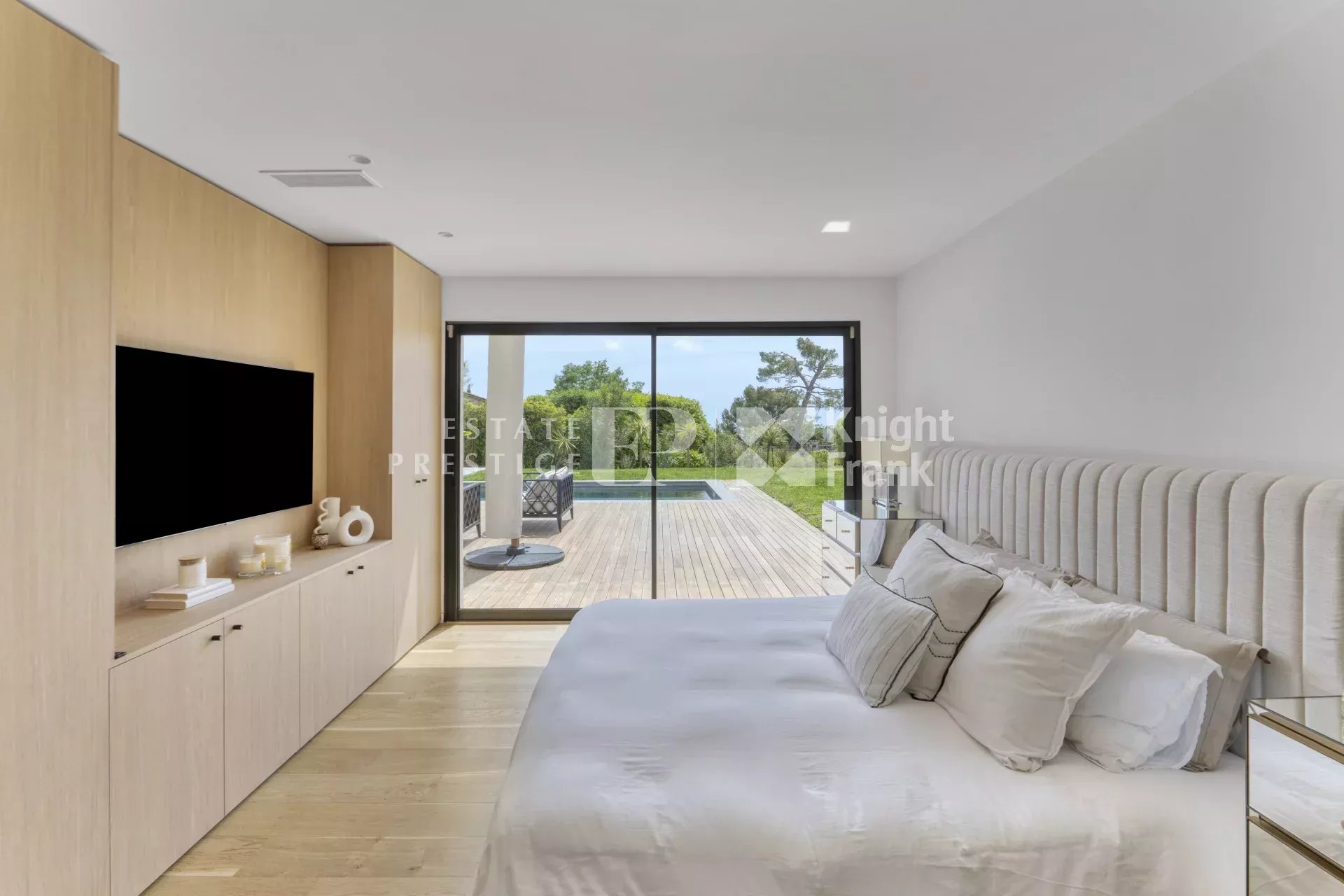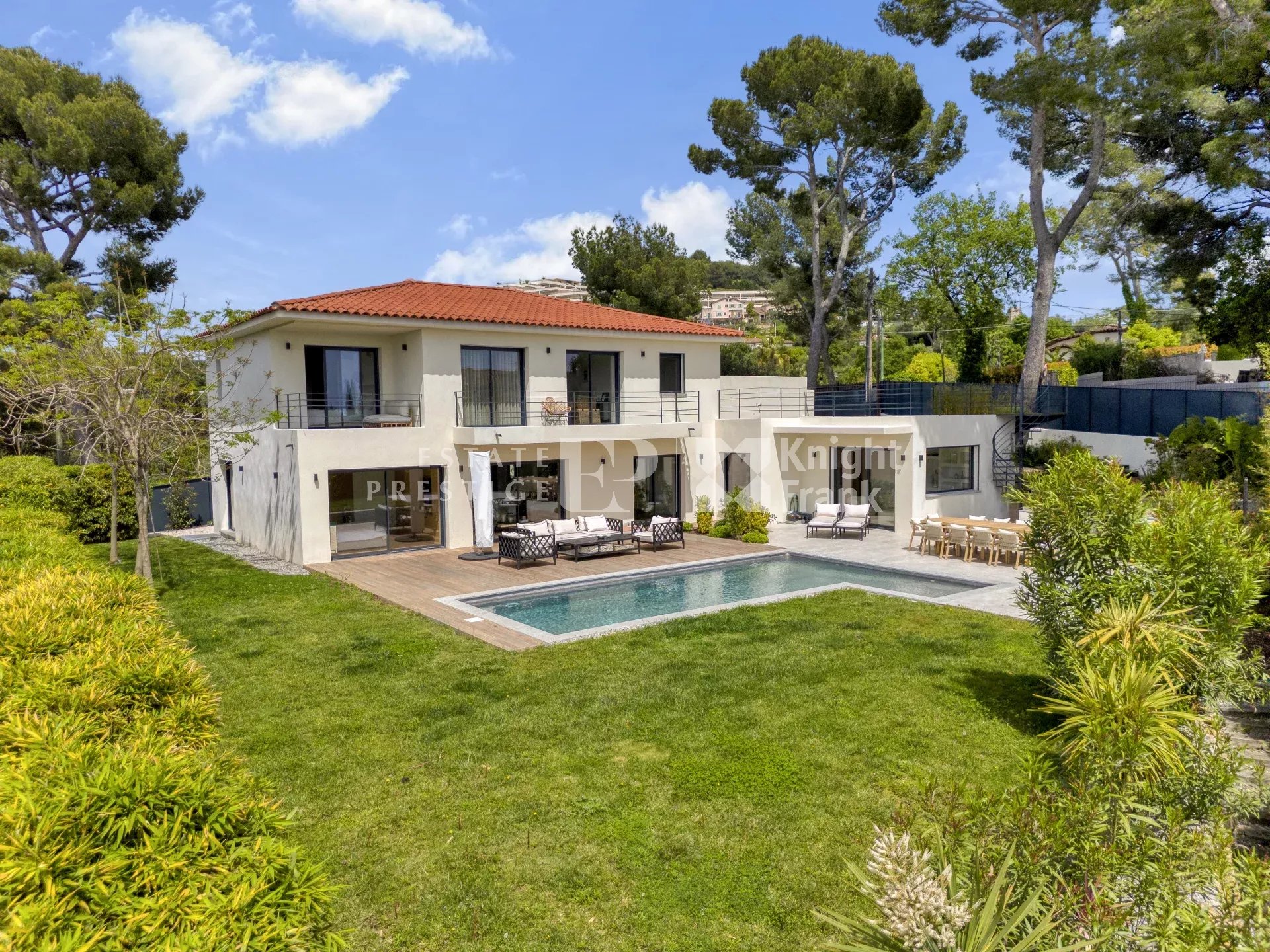 Ideelt beliggende i åsene over Le Cannet, i en dominerende posisjon uten innsyn, finner du denne praktfulle, moderne villaen på 247 m² over to plan. Eiendommen er totalrenovert til meget høy standard og ligger på en vakkert anlagt tomt på 1200 m². Villaen byr på fri utsikt mot havet fra både første etasje og terrassen.