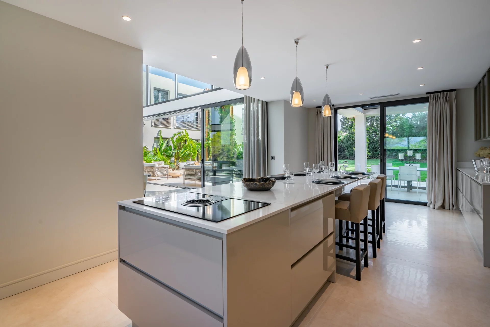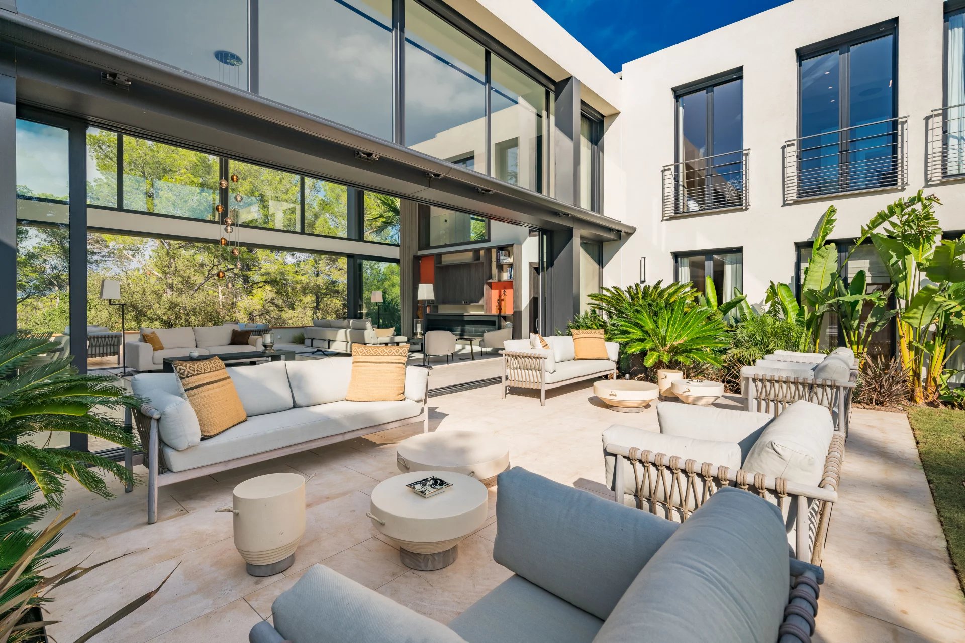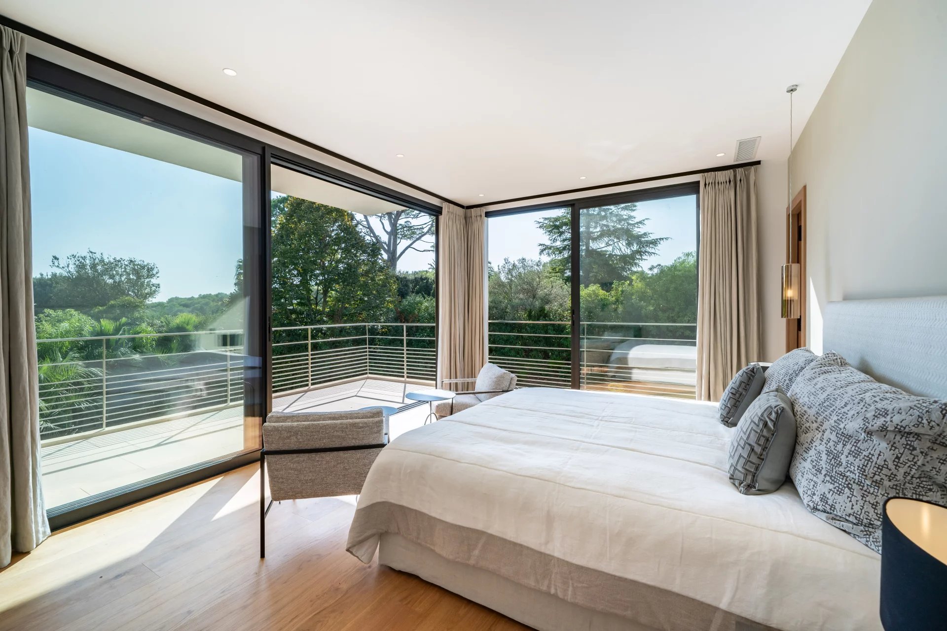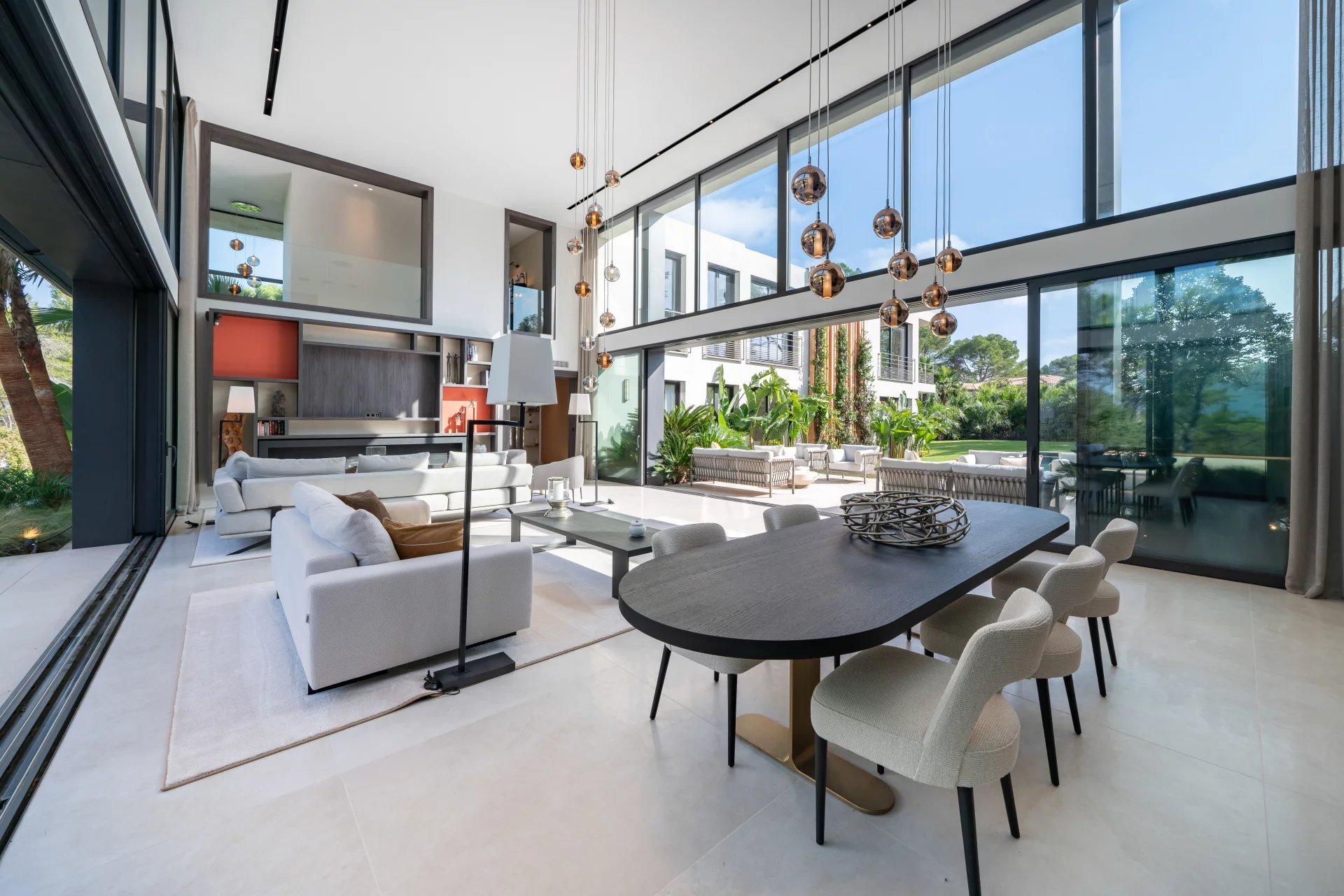 Ligger i det mest prestisjefylte gated-domenet til Mougins, drar denne praktfulle nye moderne eiendommen fordel av et veldig rolig og grønt miljø og vil forføre deg med sine rene linjer og eksklusive tjenester.