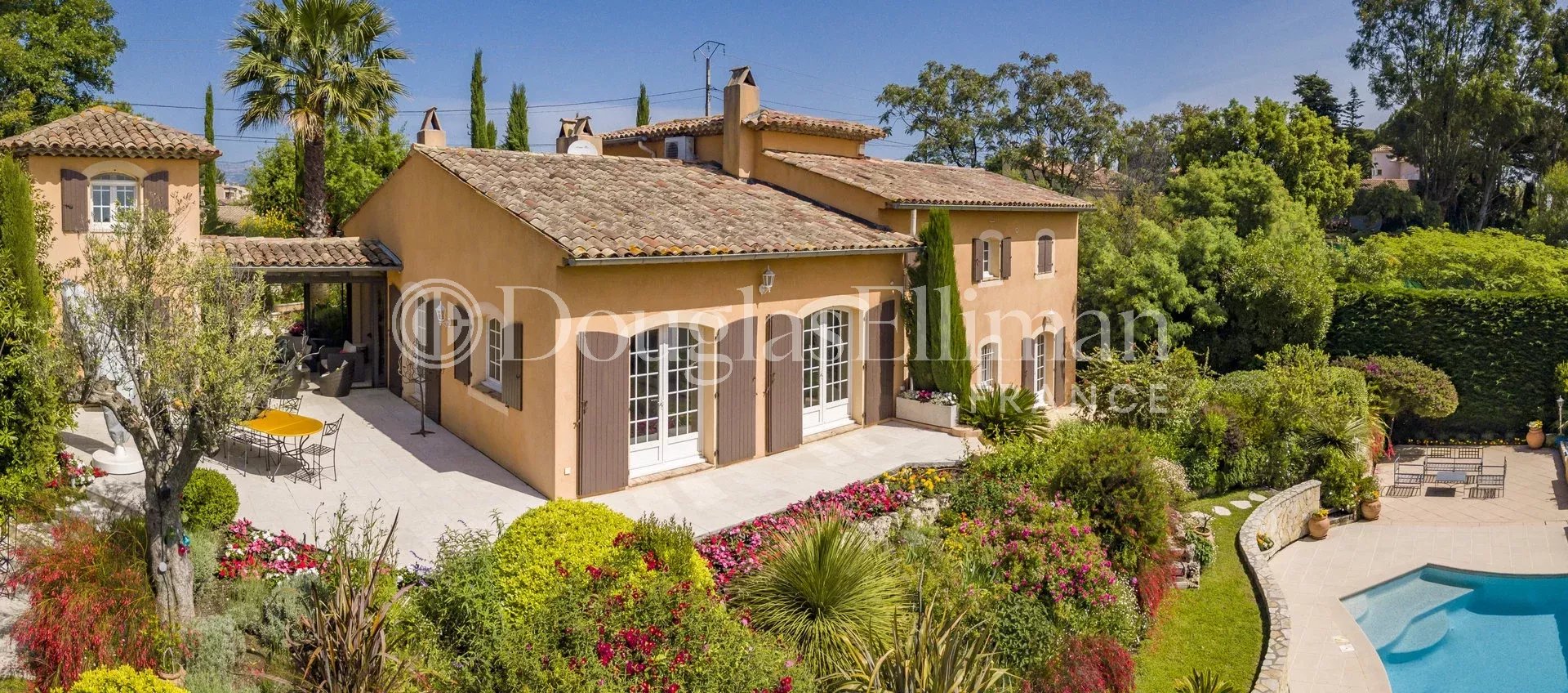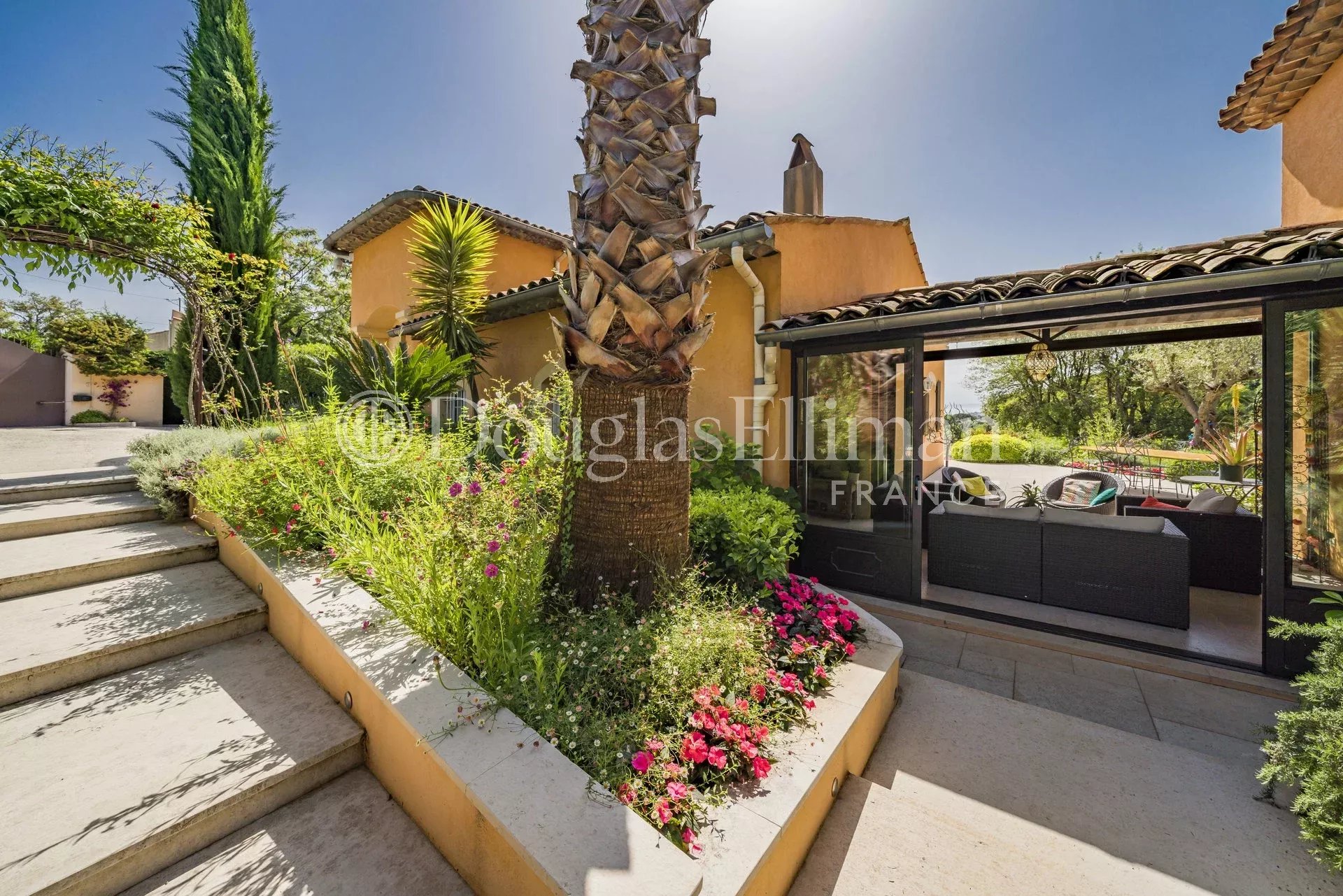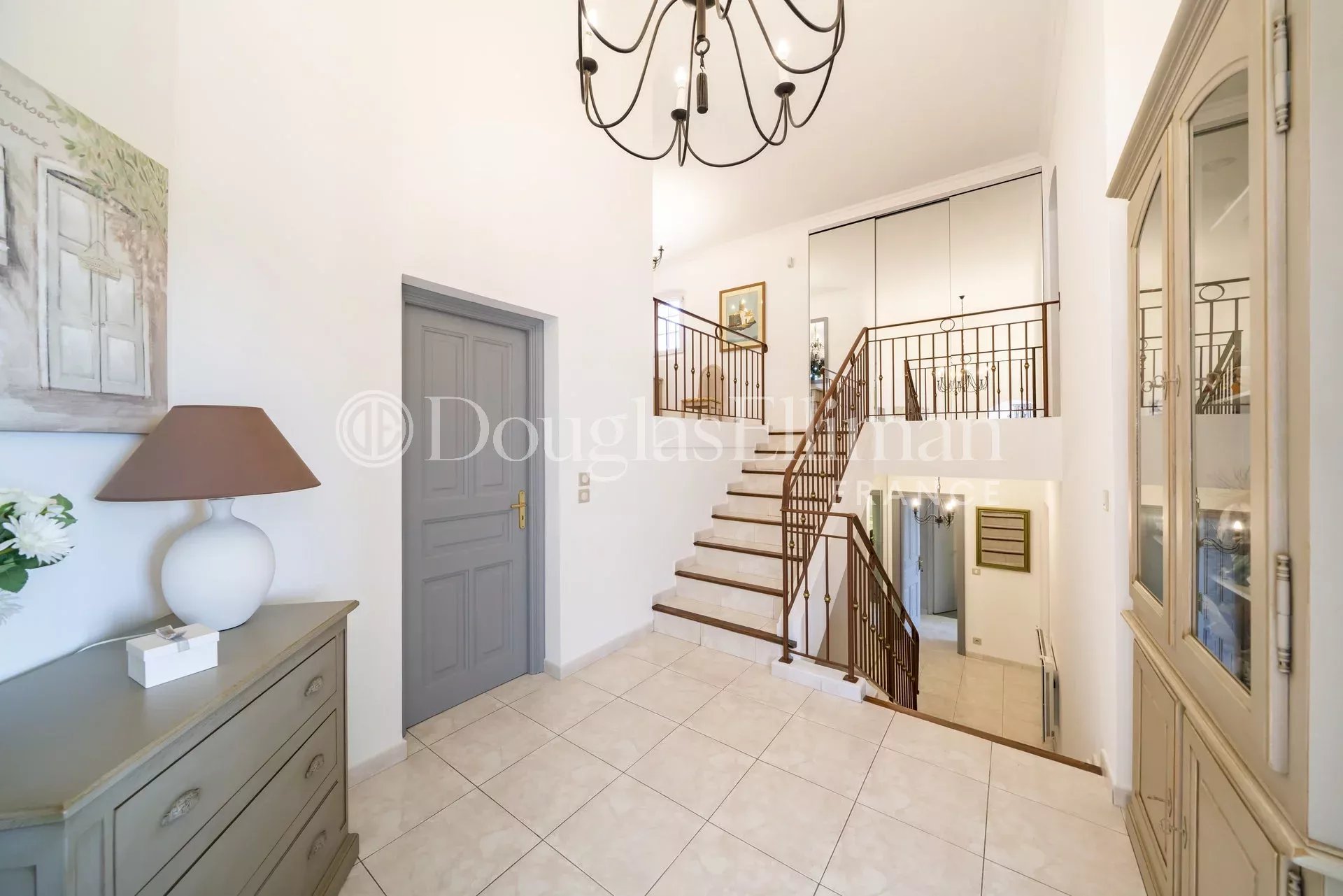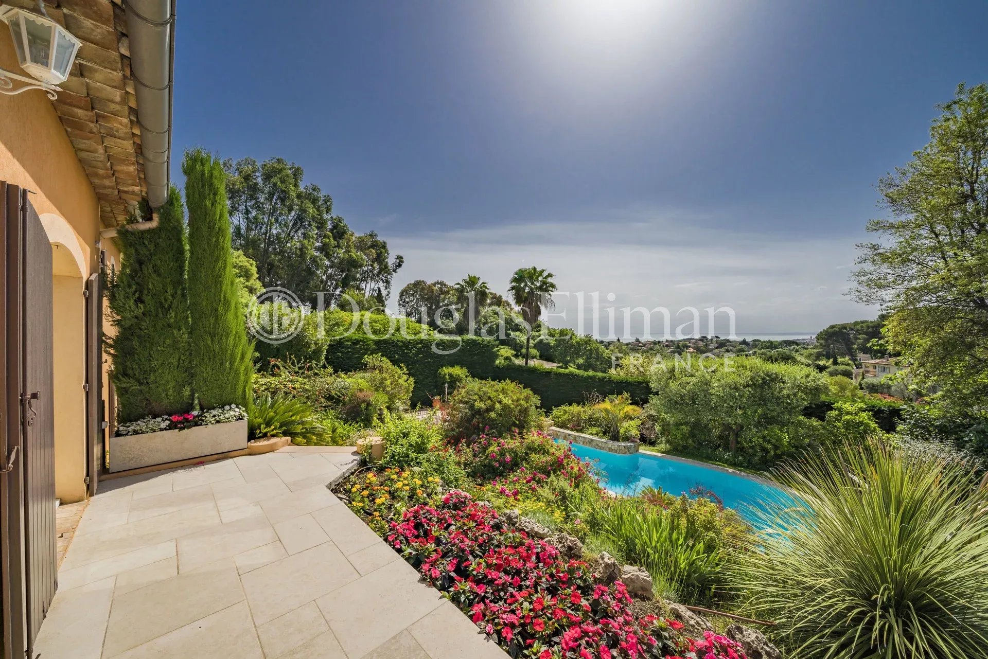 I et rolig område, kort vei til motorvei A8 og forskjellige fasiliteter, vakker villa i provencalsk stil på rundt 202 kvm boareal med praktfull utsikt over havet og omgivelsene, i utmerket tilstand, med moden hage på 1550 kvm, svømmebasseng og petanquestripe. Sørlig og østlig eksponering, mange koselige terrasser hvor du kan nyte solen, utsikten og roen.