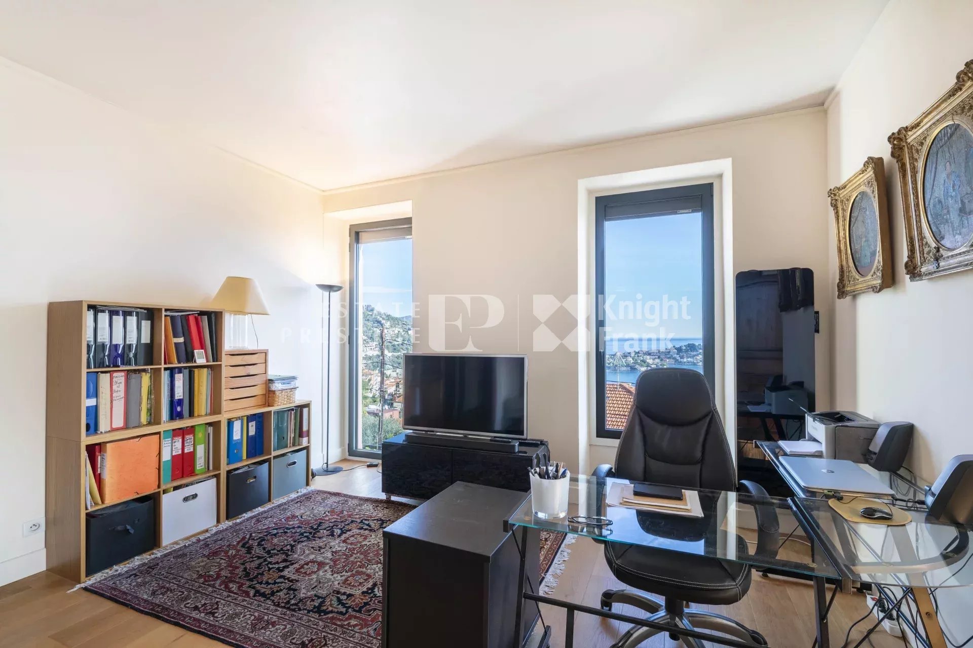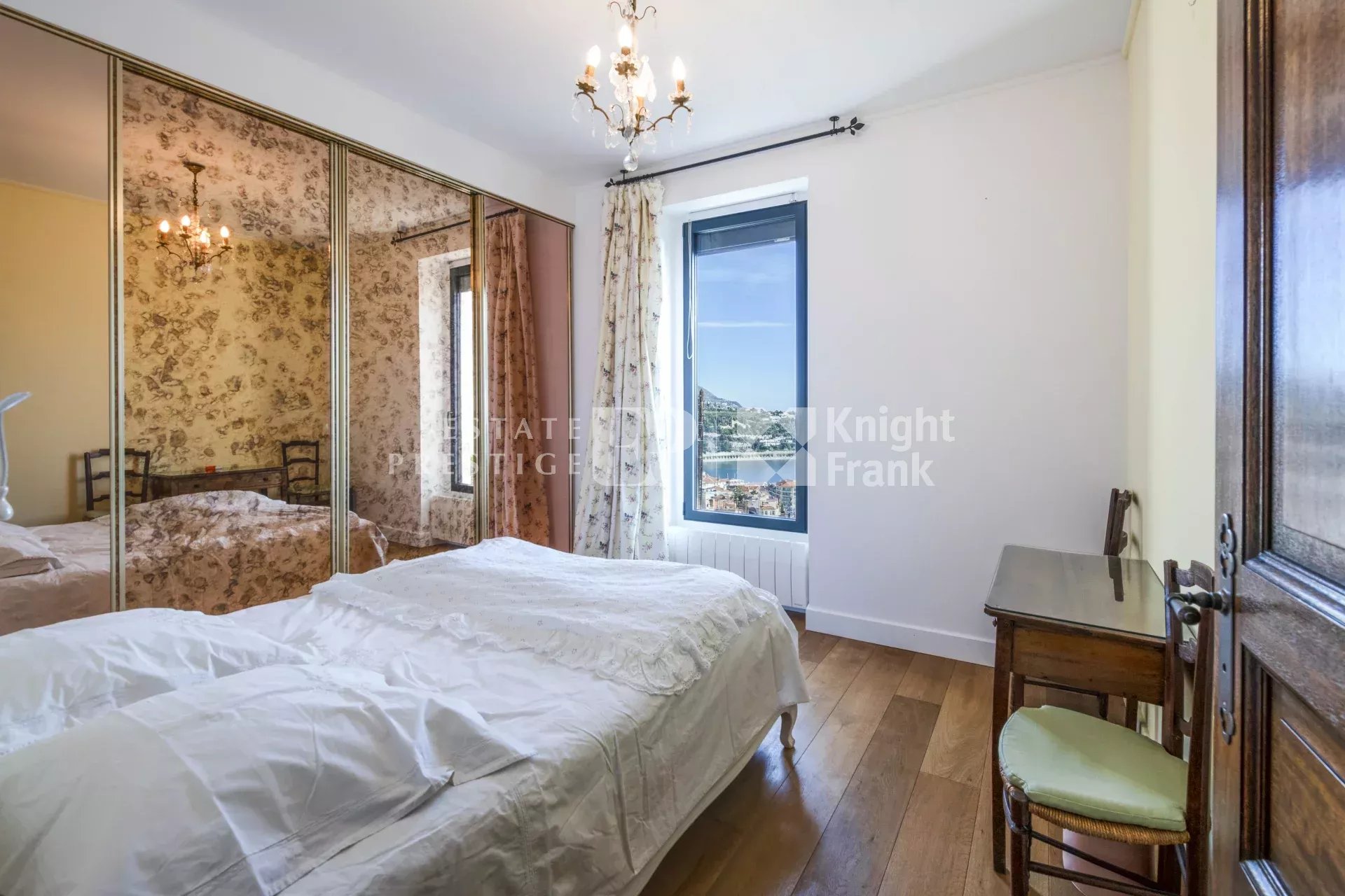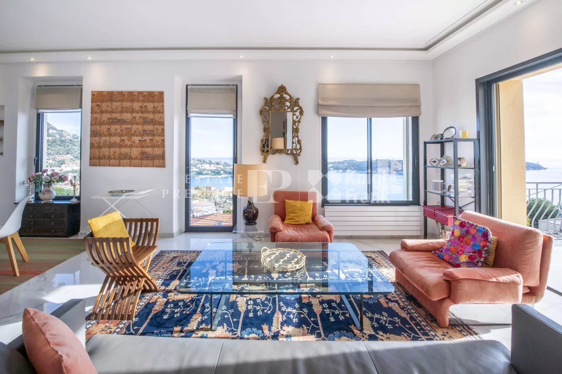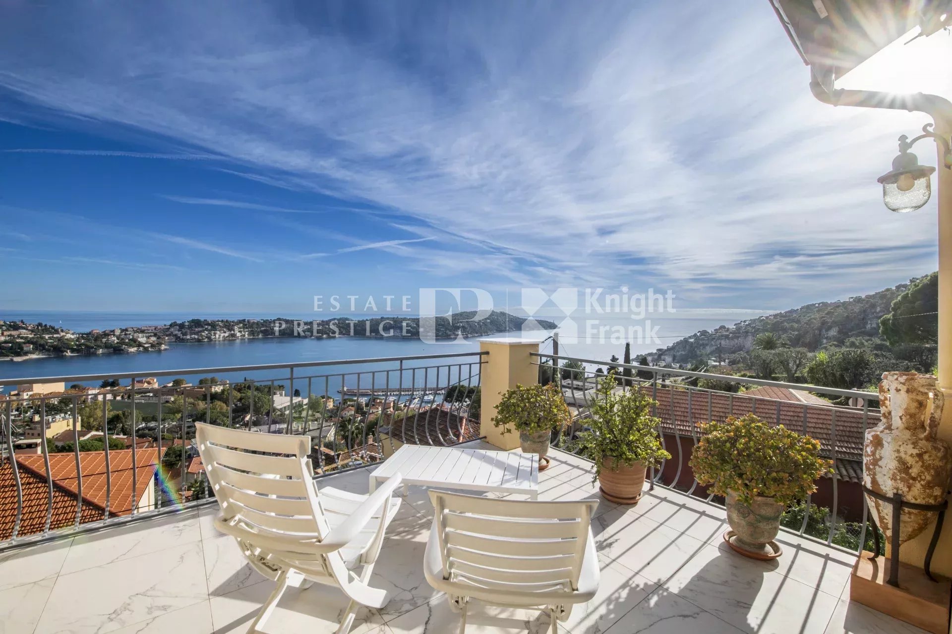 В популярном жилом районе, тихая, красивая двухуровневая квартира на 1 и 2 этаже полностью отремонтированной виллы. Из всех номеров этого уникального пентхауса открывается потрясающий вид на море. Он состоит из 2-го уровня большой яркой гостиной с большими раздвижными окнами, открывающимися на красивую террасу с видом на море, и большой хорошо оборудованной кухни с прямым выходом на террасу для приема пищи с видом на залив Вильфранш.