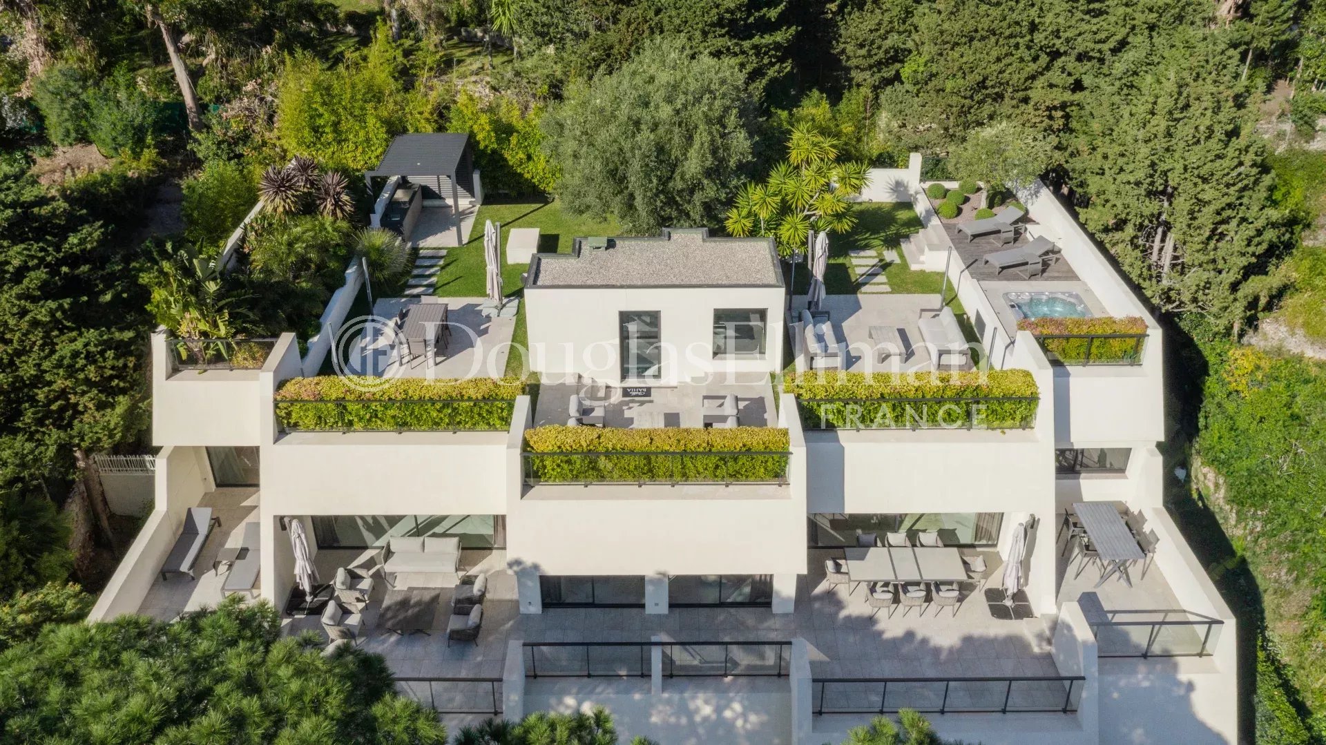Выходя на южную сторону, он имеет прекрасный вид на Средиземное море и выходит на обширную террасу площадью около 133 м² и великолепно обустроенный сад на крыше площадью около 480 м² с летней кухней и джакузи.