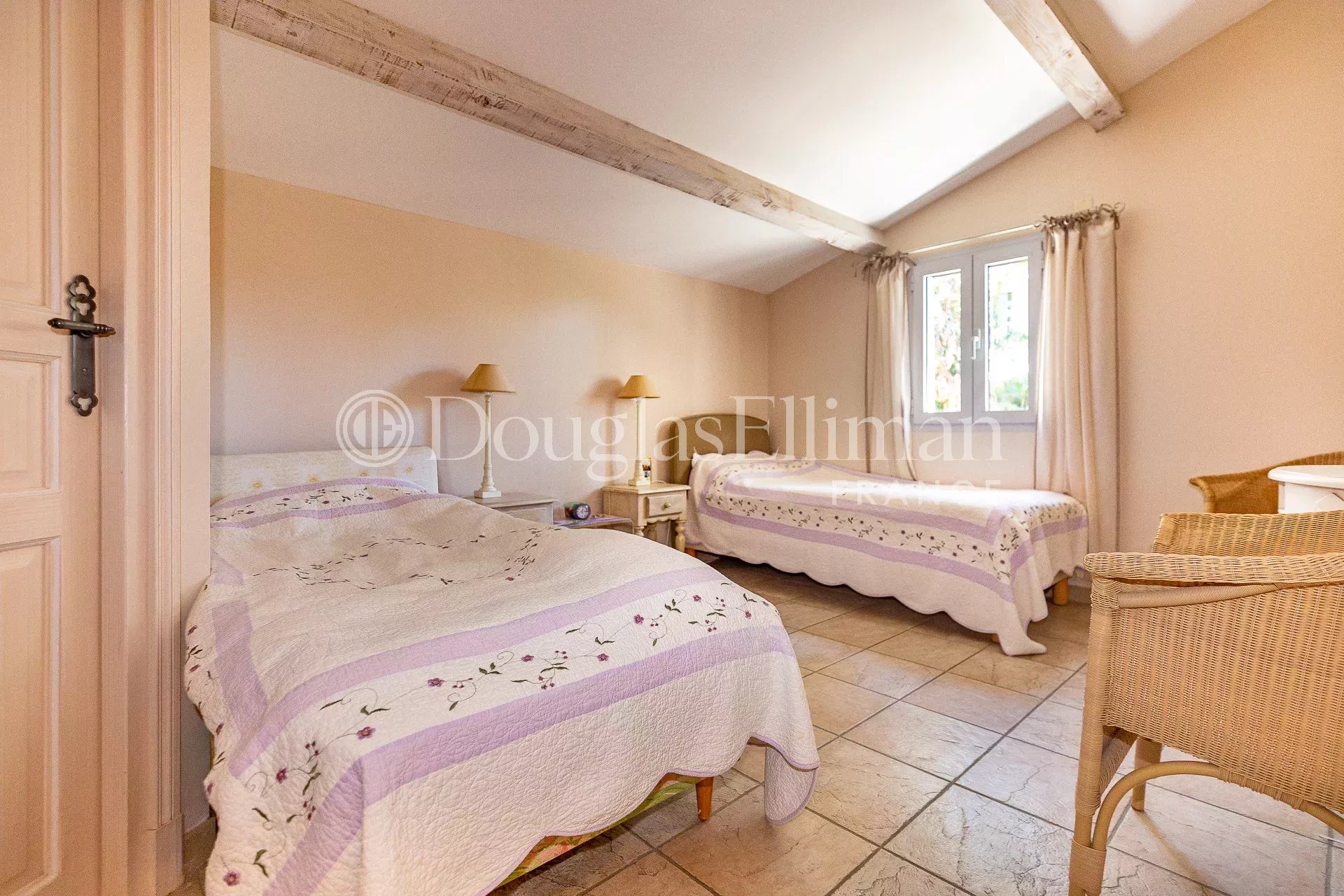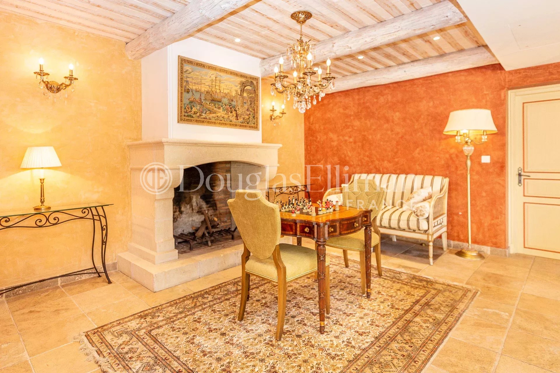 На первом этаже расположены просторная гостиная с пианино, камином и библиотекой, гостиная с баром и камином, выходящая на террасу с бассейном, полностью оборудованная кухня с обеденной зоной и три спальни, включая главную спальню площадью 100 м², каждая с собственной ванной комнатой. Наверху - четыре спальни с балконами и ванными комнатами, а также спальня для персонала.