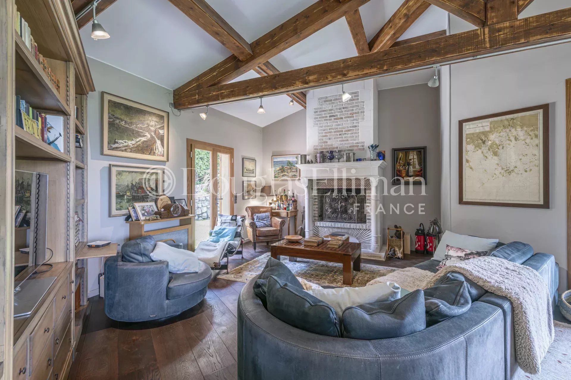 На первом этаже находится просторная гостиная с камином, выходящая в сад и на террасу, две спальни и ванная комната.