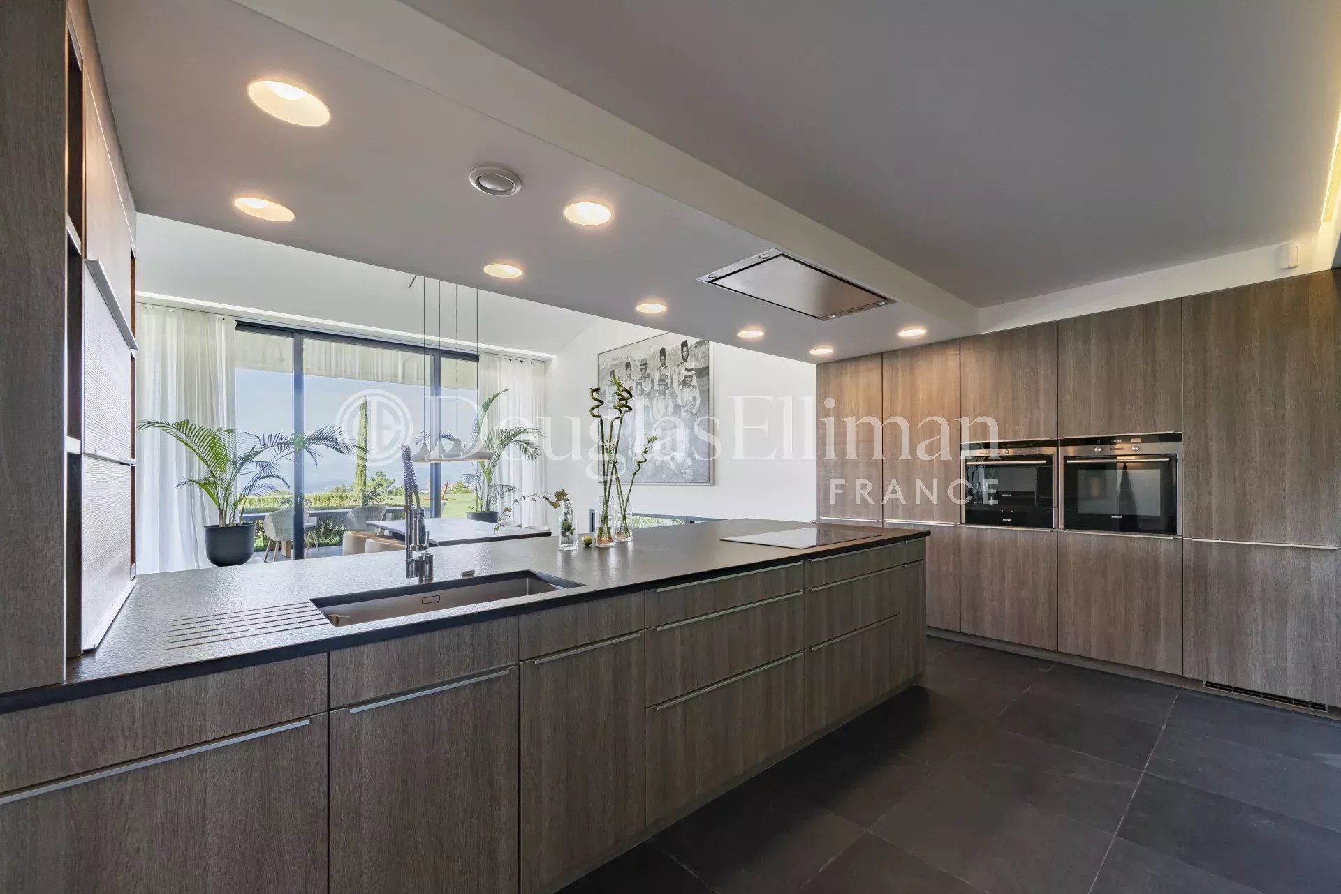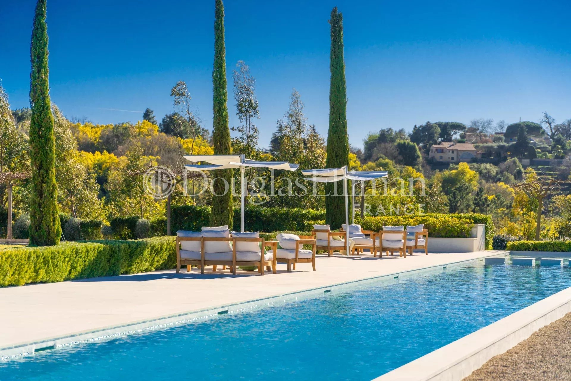 На участке площадью почти 2 га разбит пышный ландшафтный сад с оливковой рощей, соснами, красными деревьями, кедрами, дубами и мимозами, вокруг которого расположены 34-метровый бассейн, японский пруд с карпами кои и площадка для игры в петанк.