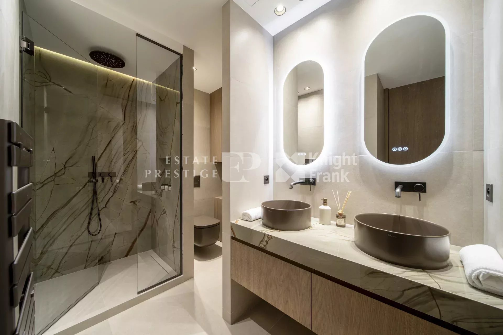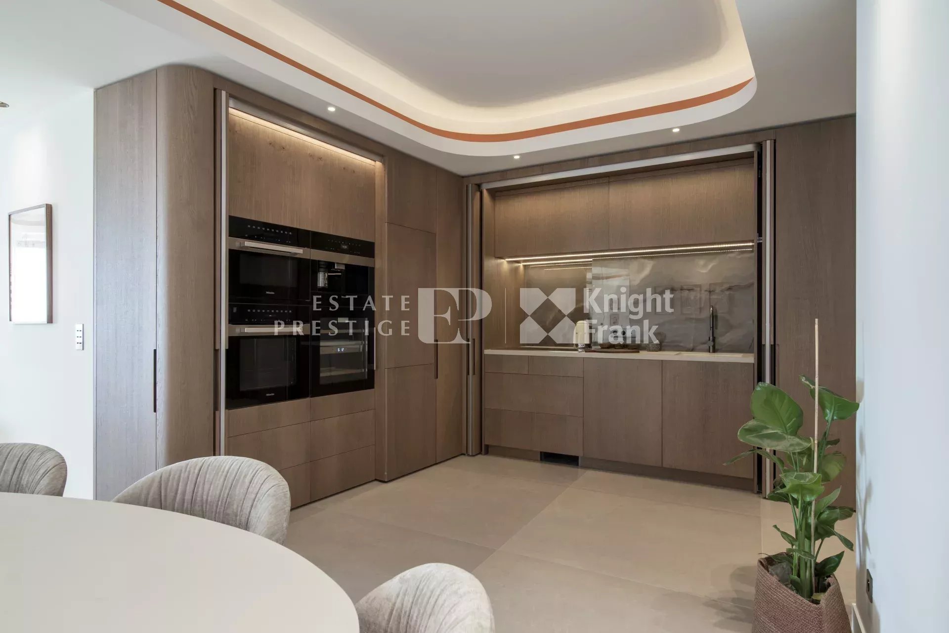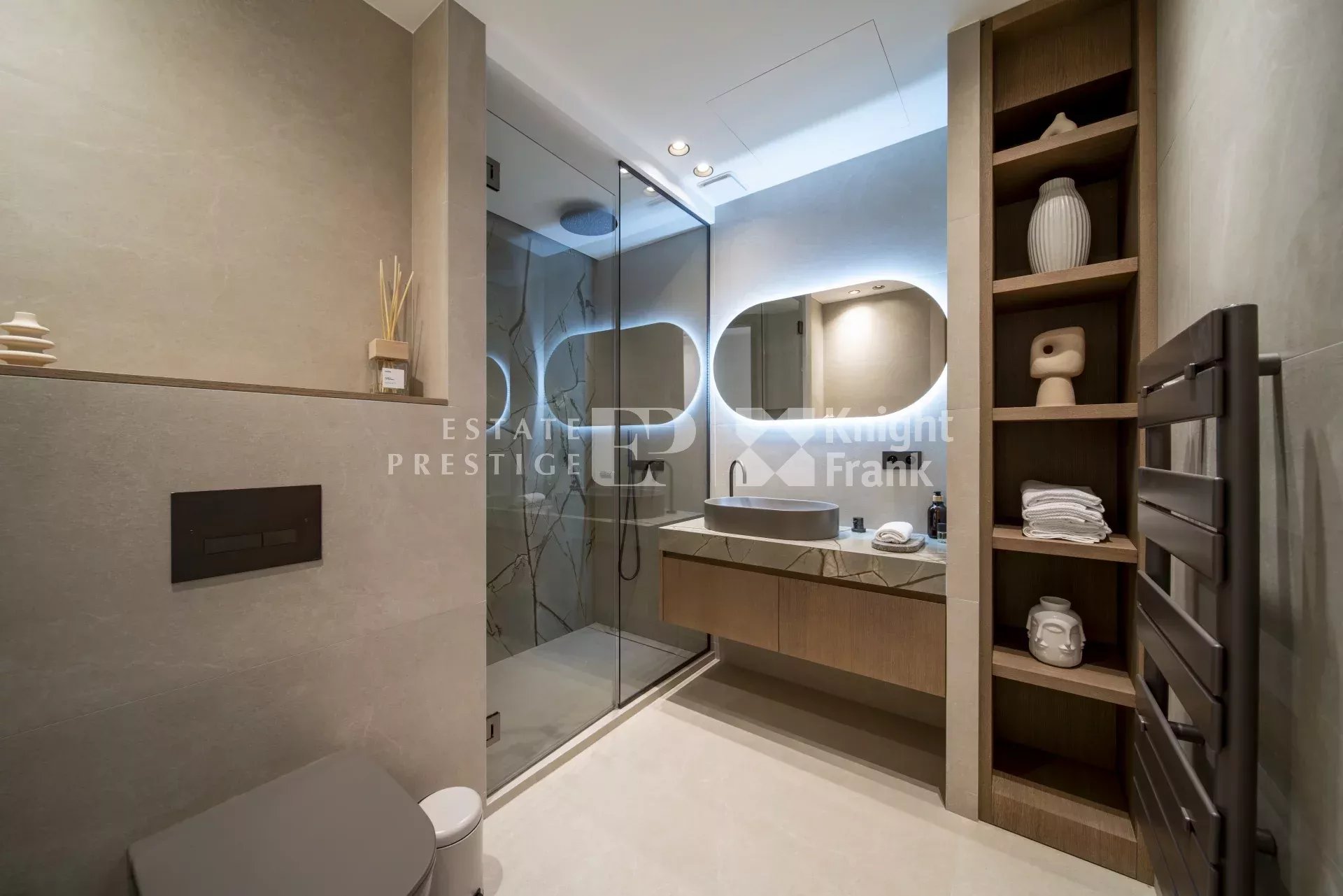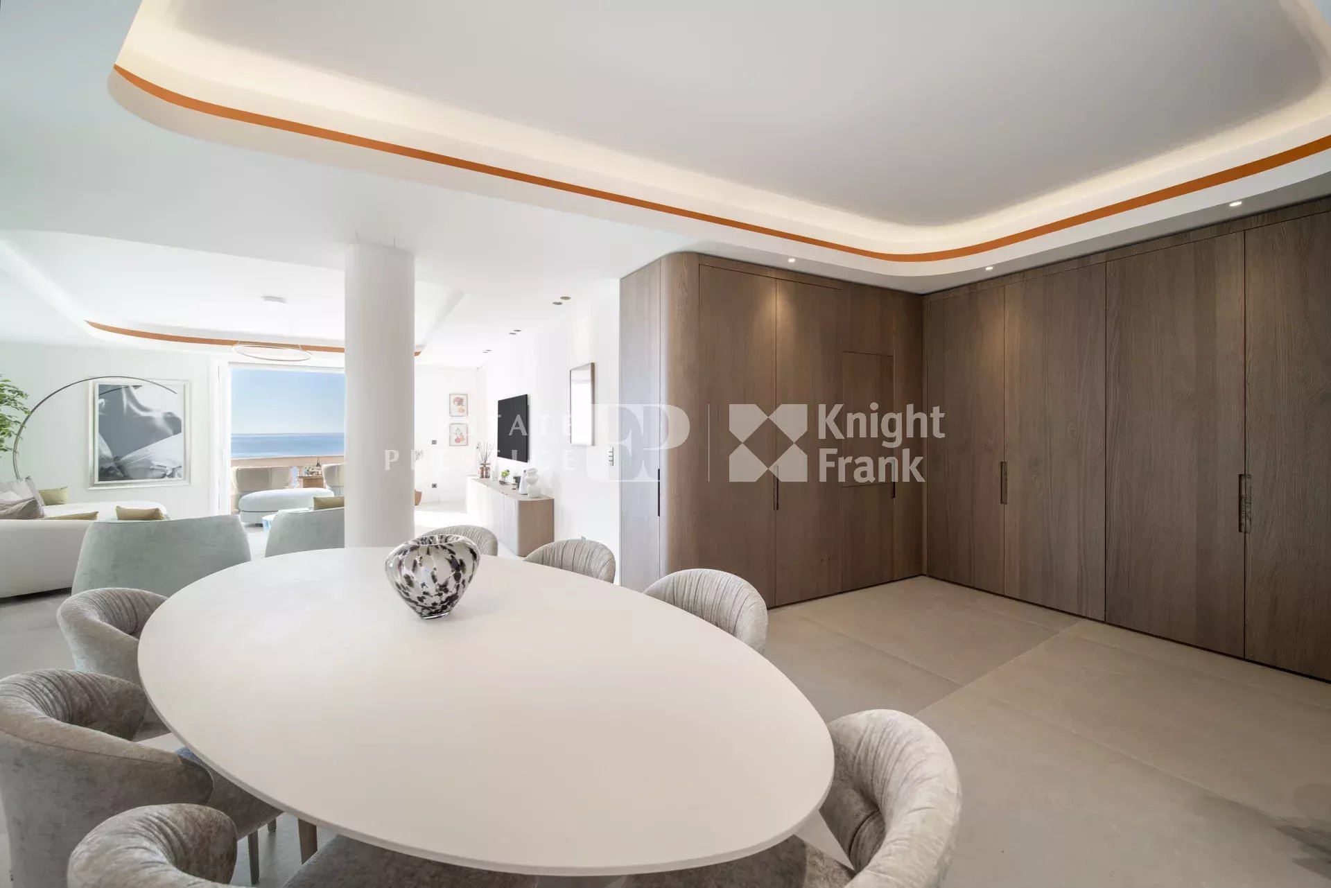 Недавно отремонтированная квартира состоит из прихожей со встроенными шкафами, просторной гостиной/столовой, выходящей прямо на террасу с видом на море, оборудованной кухни открытого плана с прачечной, главной спальни с гардеробной и ванной комнатой, двух других спален, ванной комнаты и гостевого туалета.