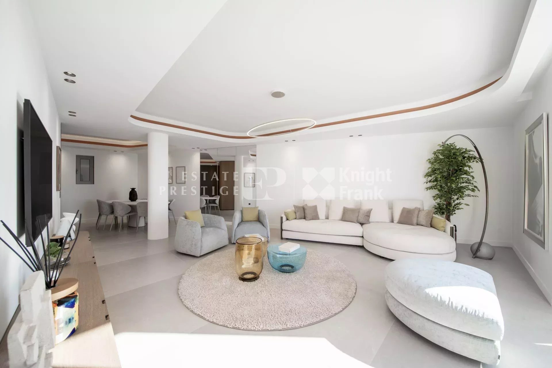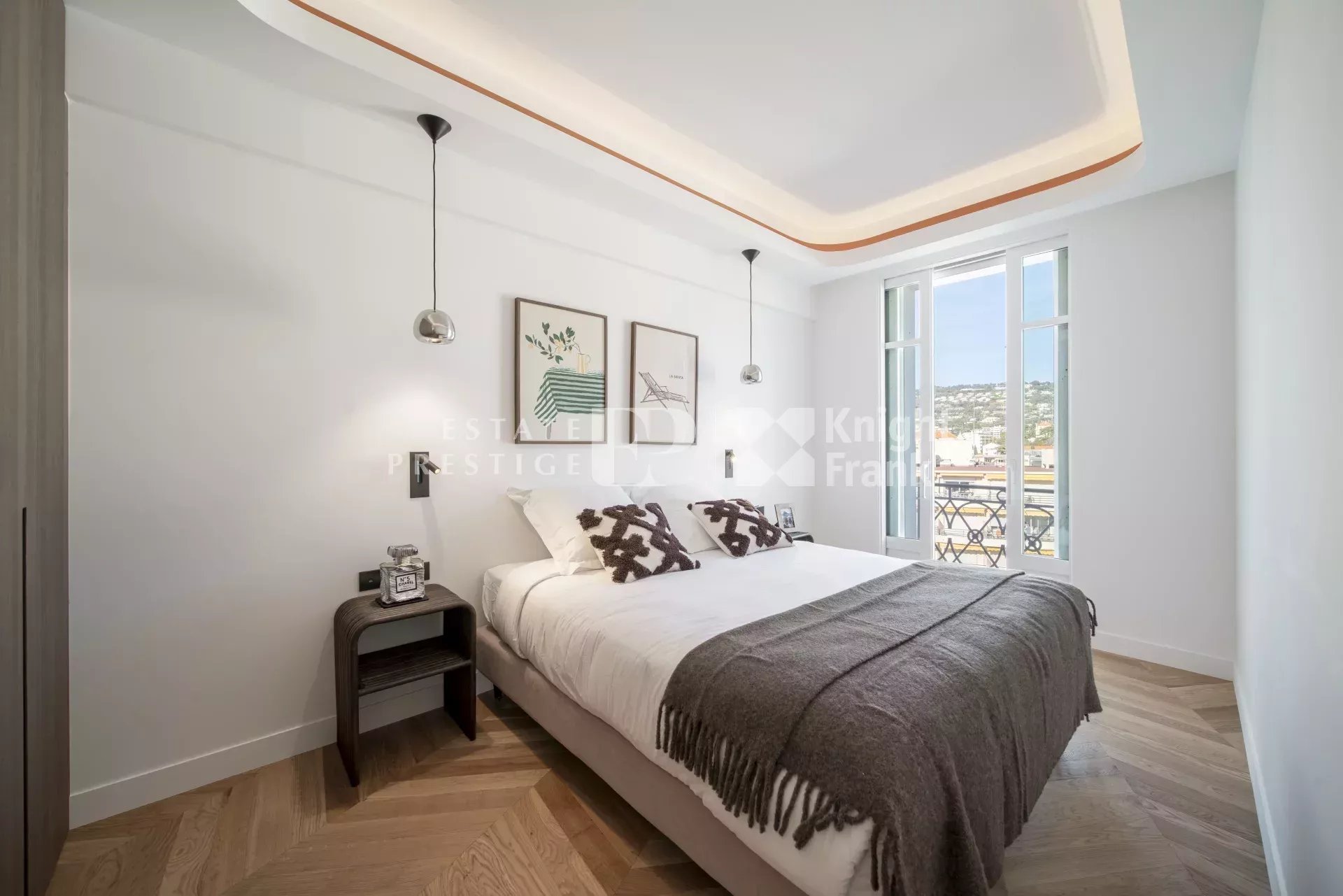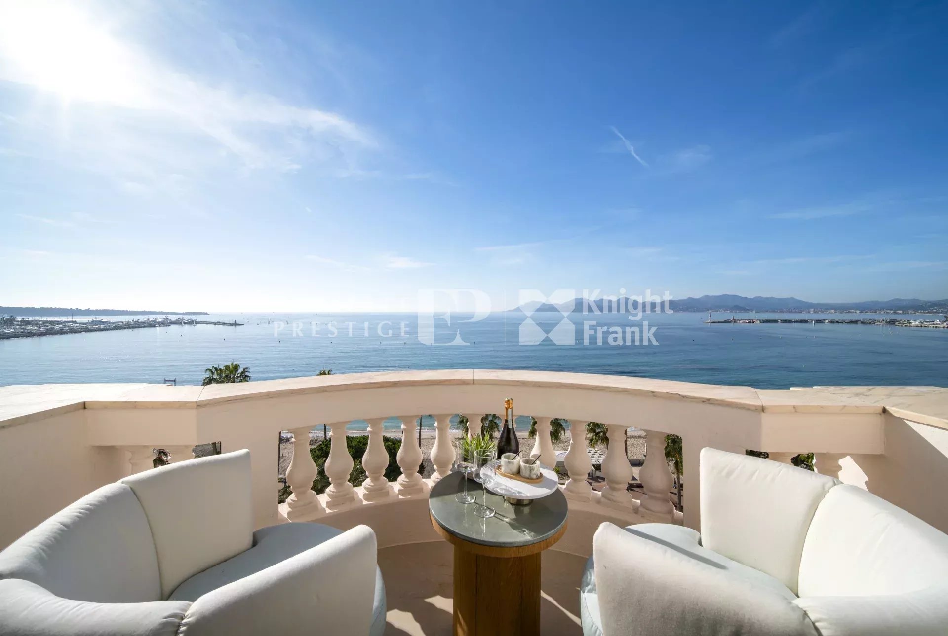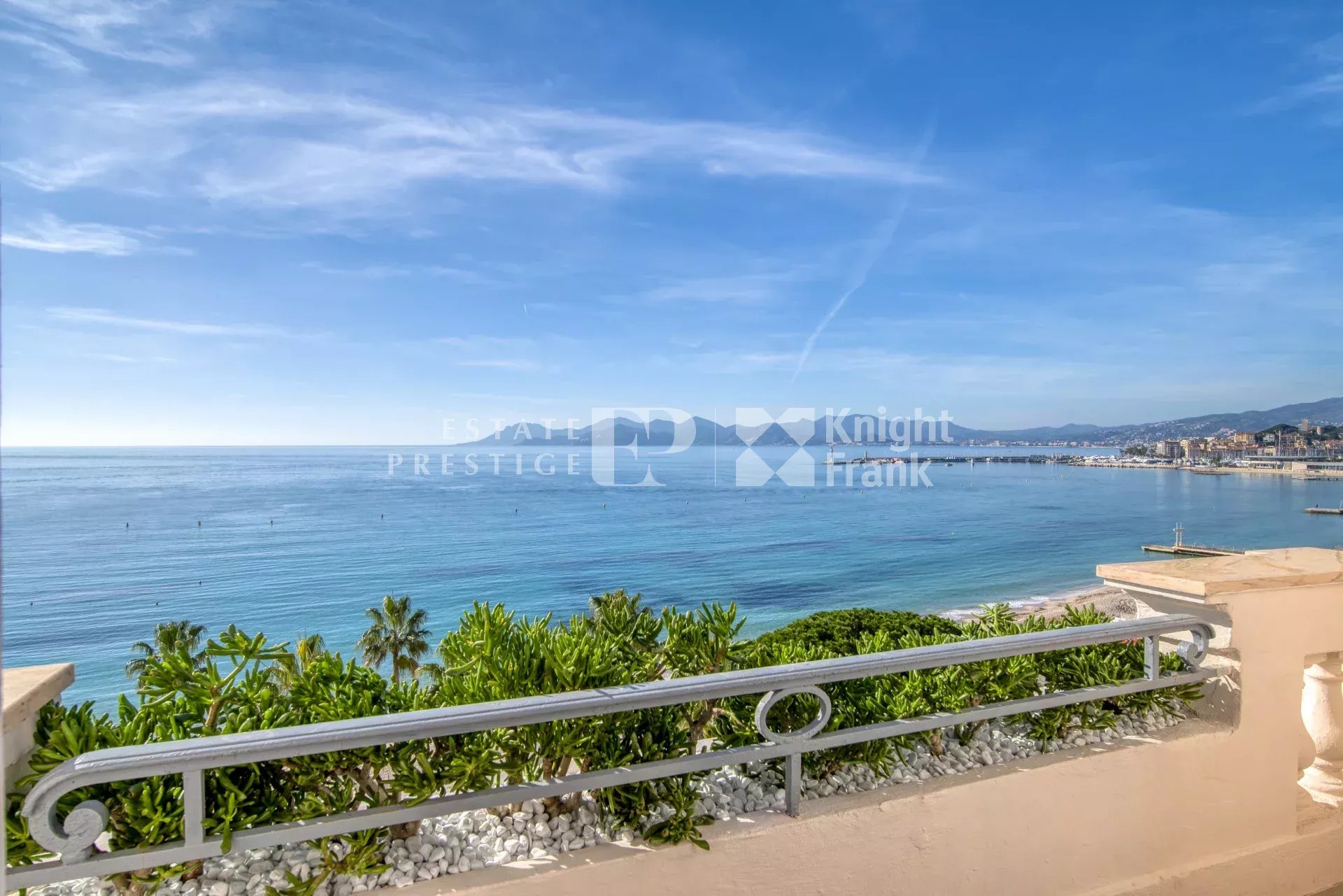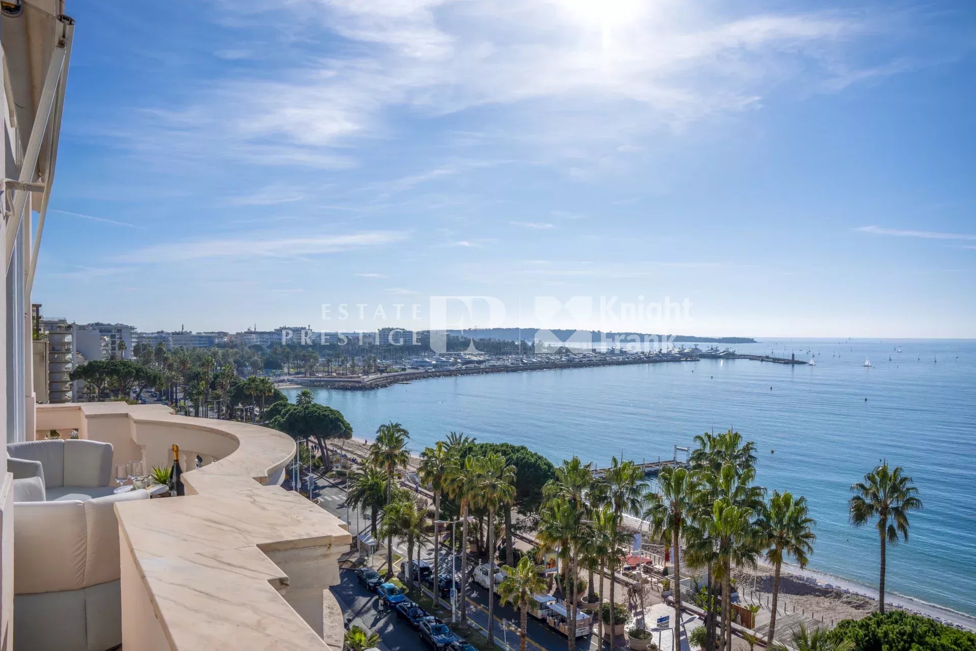 Красивая 4-комнатная угловая квартира площадью 111 м2, расположенная на верхнем этаже, с большой террасой площадью 54 м2 и великолепным видом на Каннский залив.