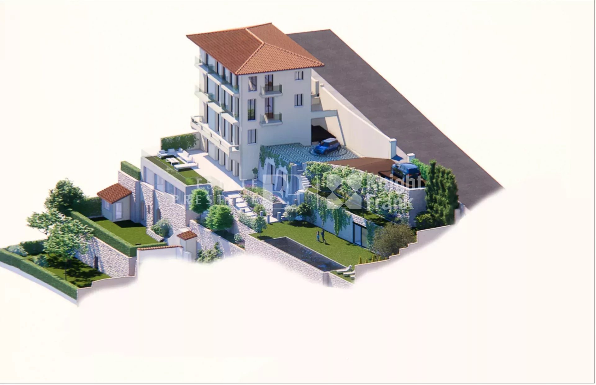 Разработан предварительный проект планировки, предлагающий размещение жилых помещений на садовом уровне (приемная площадка, гостиная, столовая, кухня) и создание 7 люксовых номеров, включая просторную главную спальню с двумя ванными комнатами, распределенными на 3 этажа и обслуживаемых лифтом. Два нижних уровня могут быть выделены под квартиру смотрителя, тренажерный зал, прачечную (и т. д.).